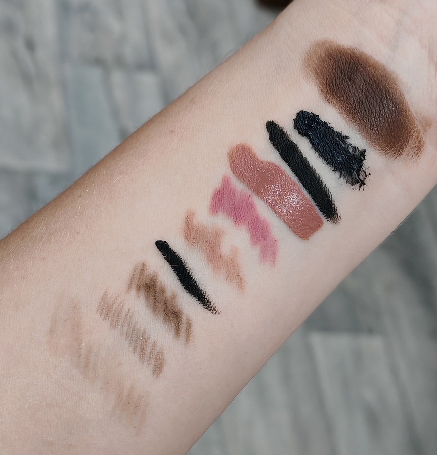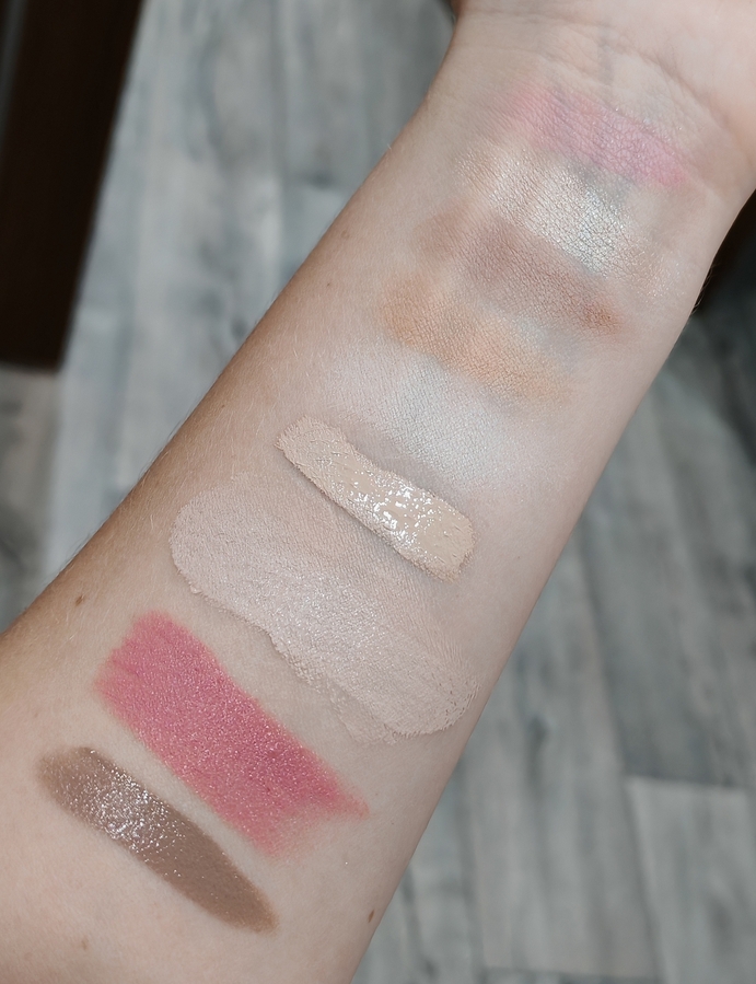 Слева-направо на руке нанесены: кремовый скульптор, кремовые румяна, тон, консилер, пудра, бронзер, скульптор, хайлайтер, румяна.