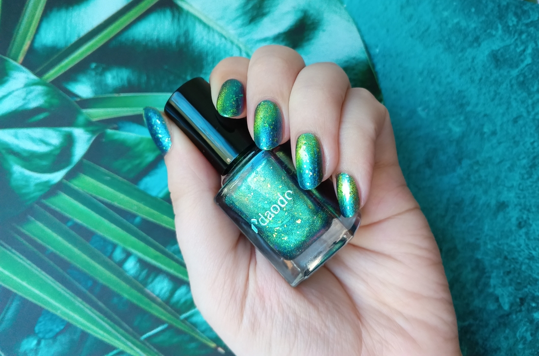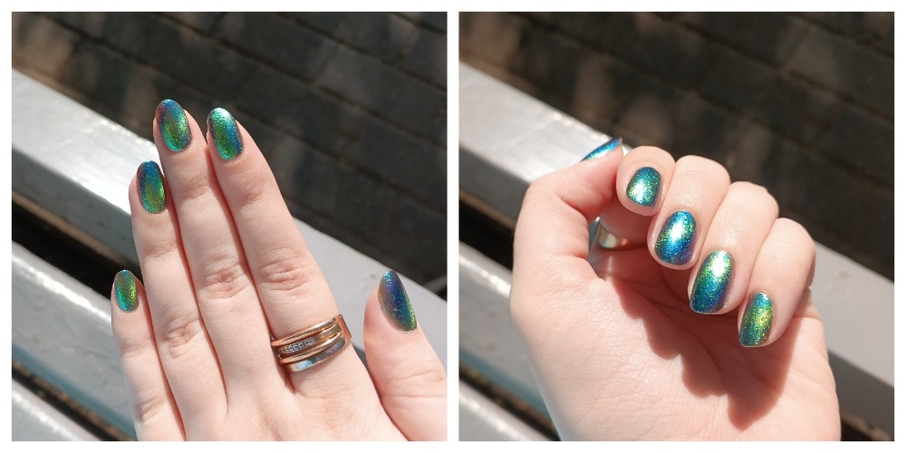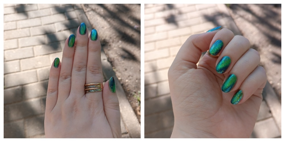 На солнце лак искрится, чуть отливает металлом. А магнитный блик приобретает совершенно особенную аквариумную глубину.