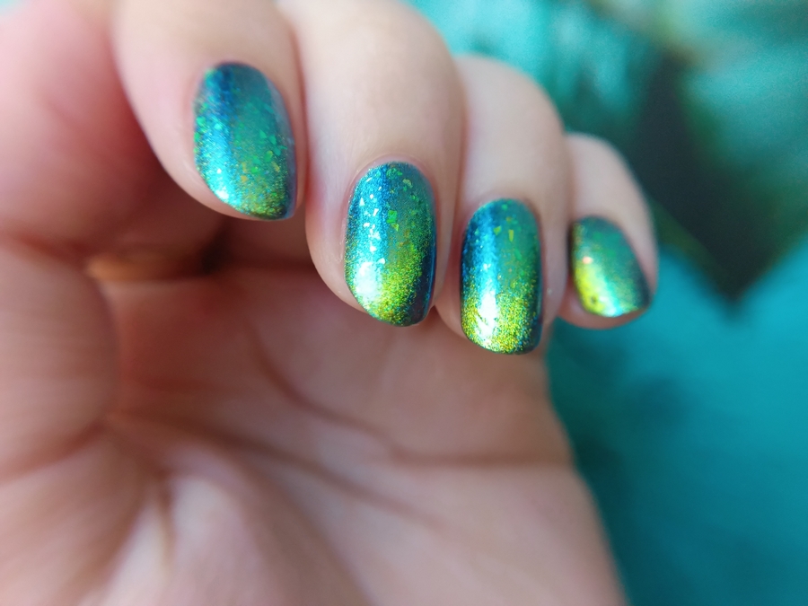 Изумительное сочетание насыщенной синей базы и желто-зеленого шиммерного блика вместе с ядовитой желто-зеленой же слюдой. Я вообще люблю сочетание синего и желтого. По-моему это очень красиво!
