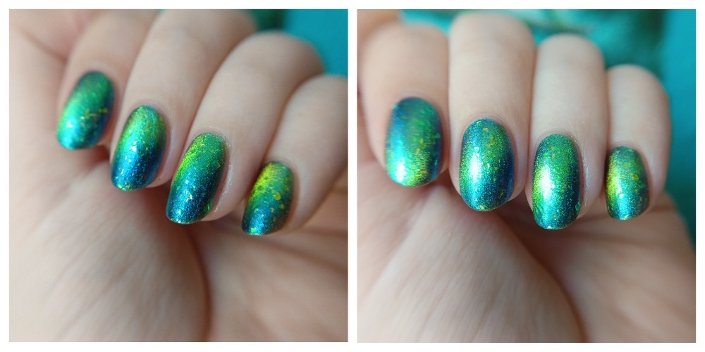 Лак с ярким сине-голубым эффектом аврора, золотисто-ярко-зеленой слюдой и ярким желто-зеленым магнитным бликом в прозрачной базе. На коллаже ниже я показываю лак в покое (слева) и лак после того, как я к нему поднесла магнит (справа). Какая красота!