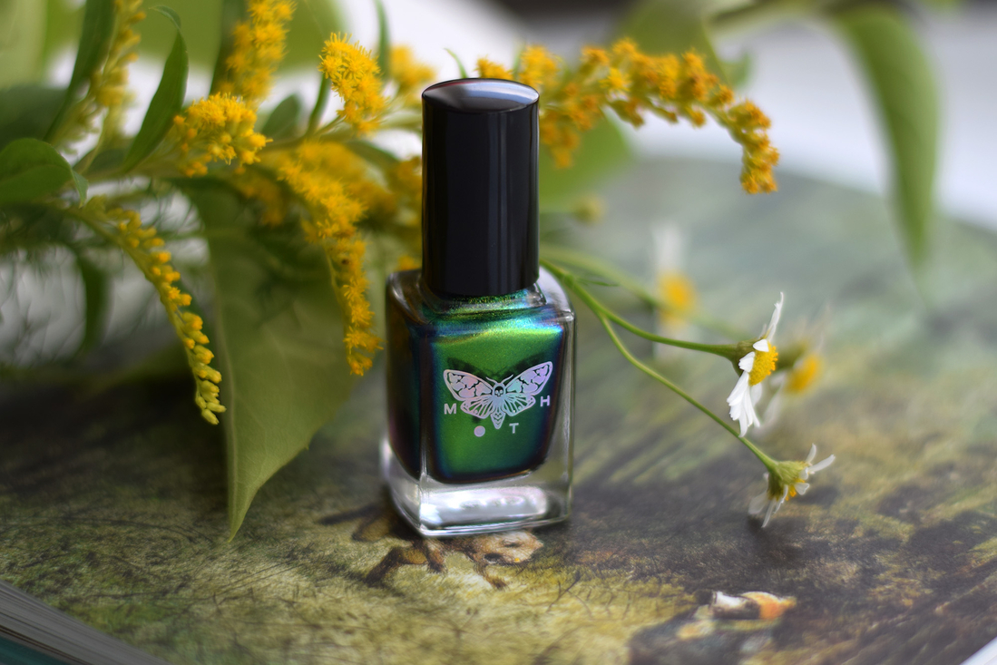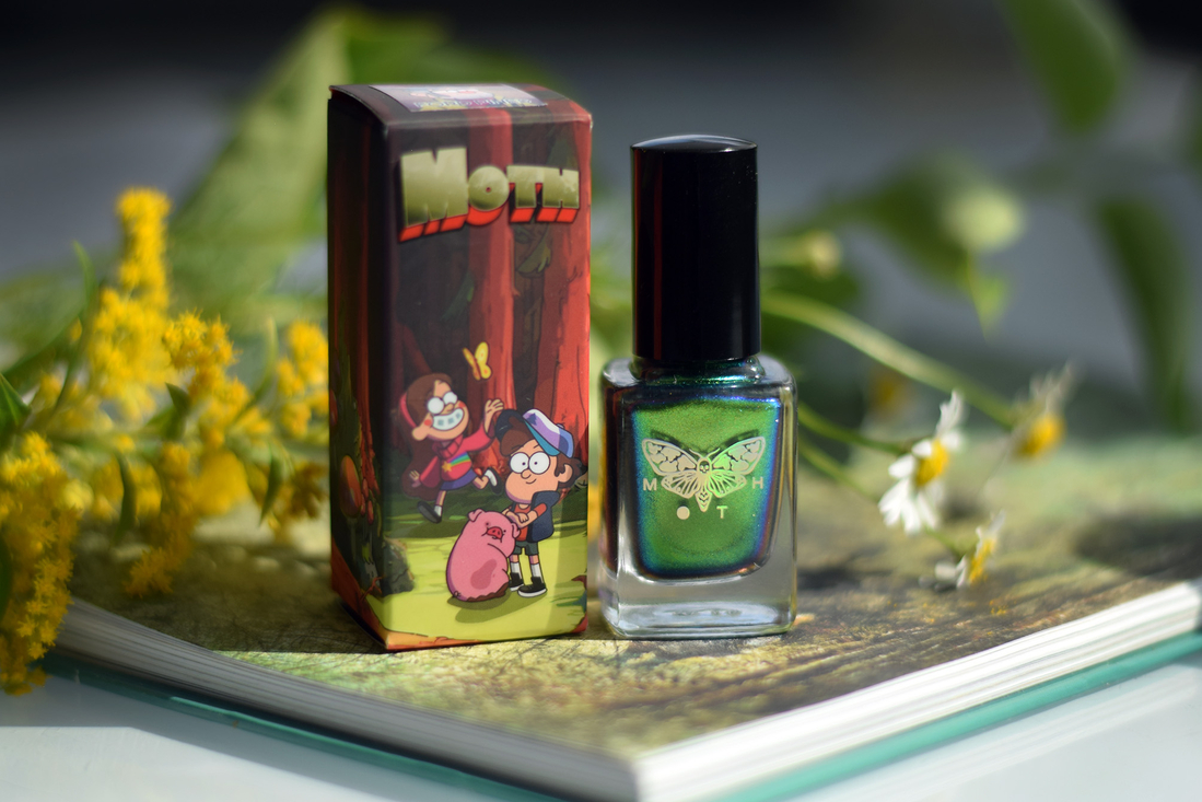 Этот лак от российского инди-бренда Moth я урвала на Чёрной Пятнице — когда в продажу выставили лаки-старички. Коллекция посвящена мультфильму Gravity Falls, и мой лак называется Ford Pine (персонаж из мультика Форд Пайнс).