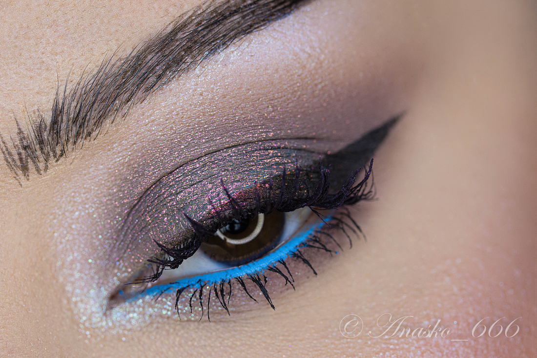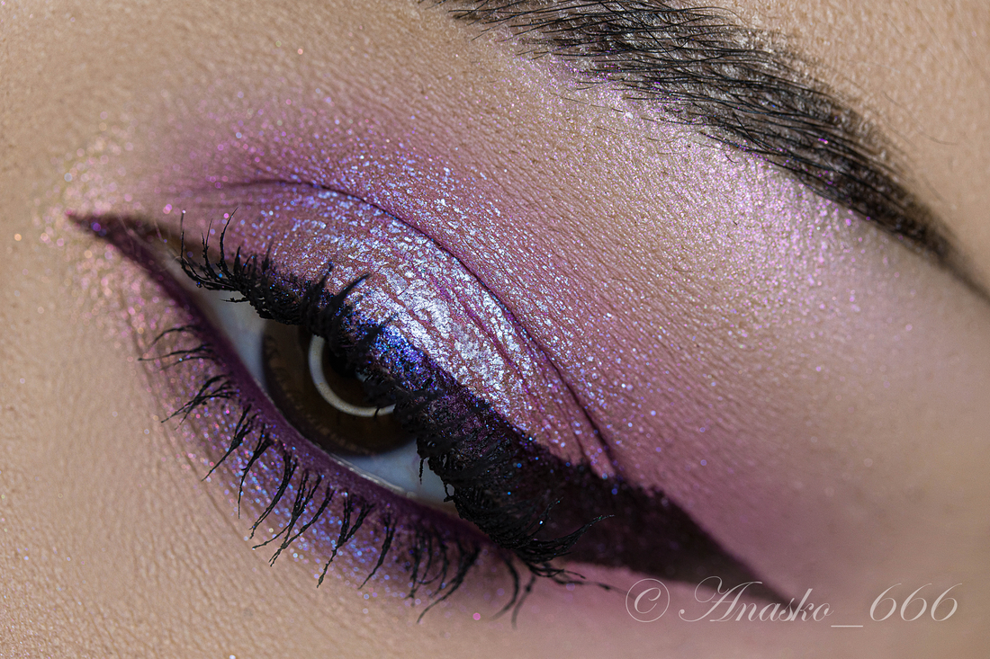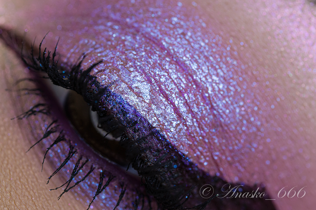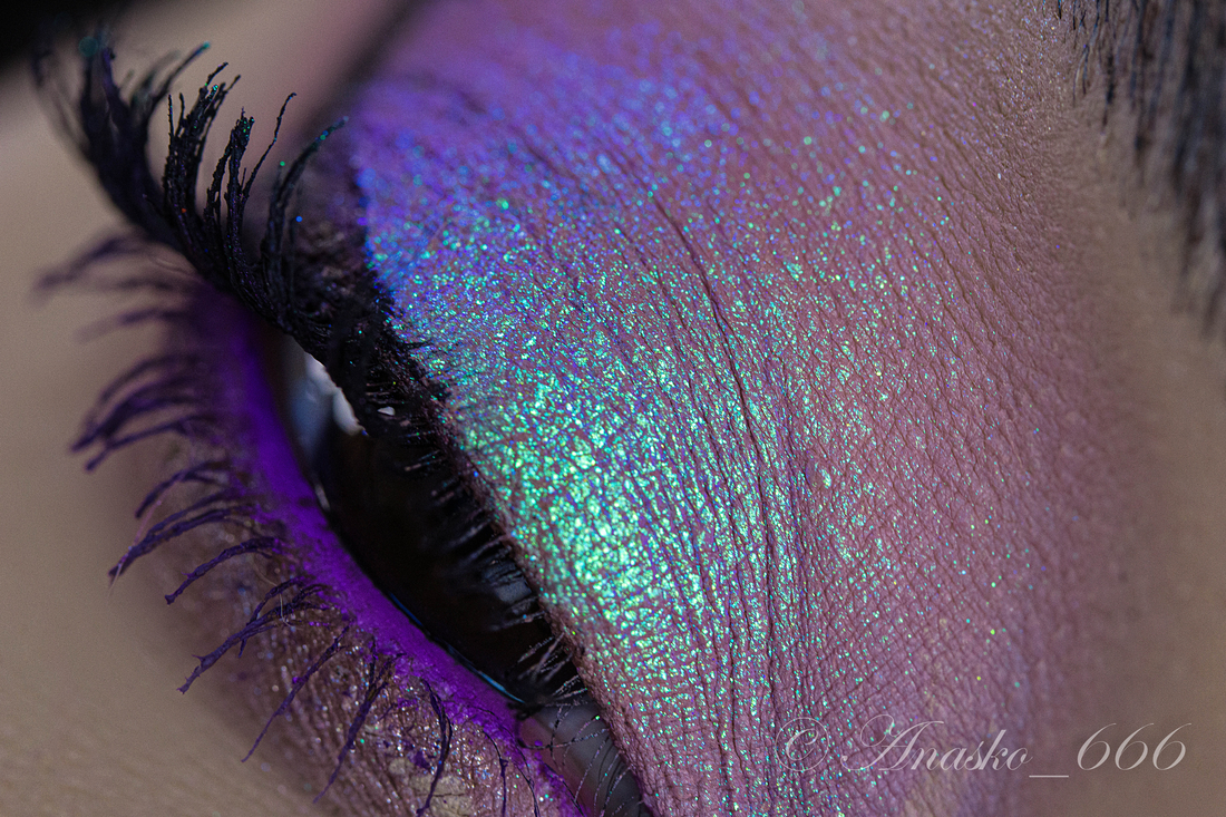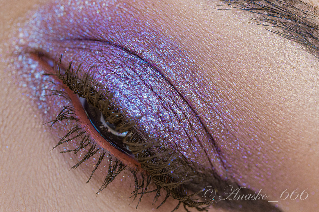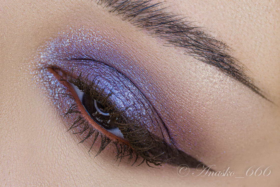 Сизо-синий сатин на фиолетовой базе, на макро можно разглядеть редкие включения серебряного шиммера, но в макияжах его не особо и видно.