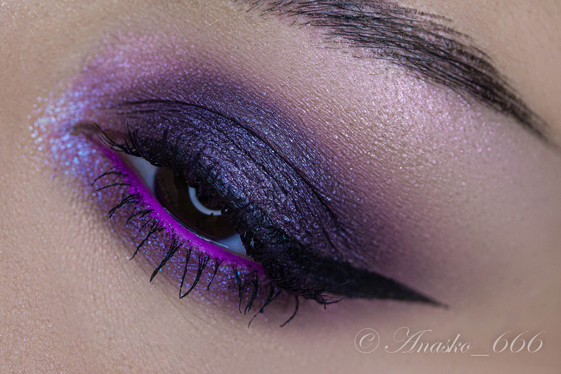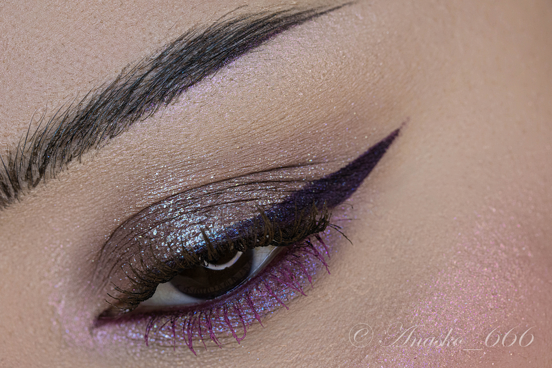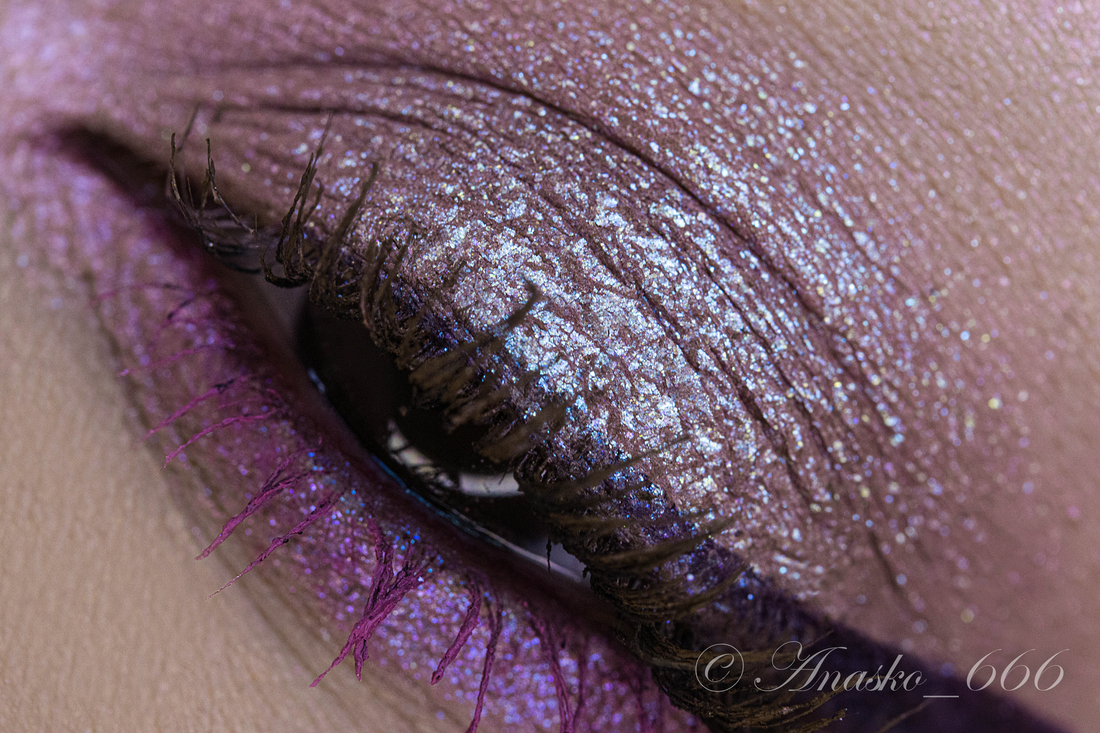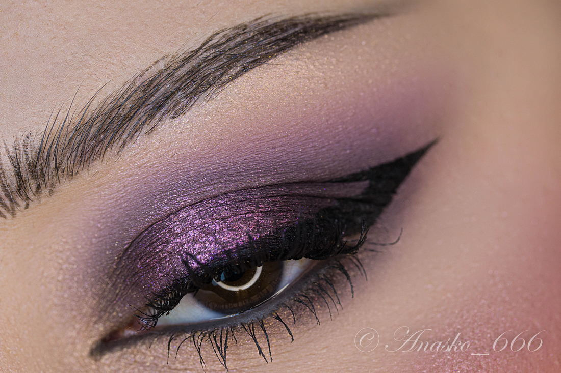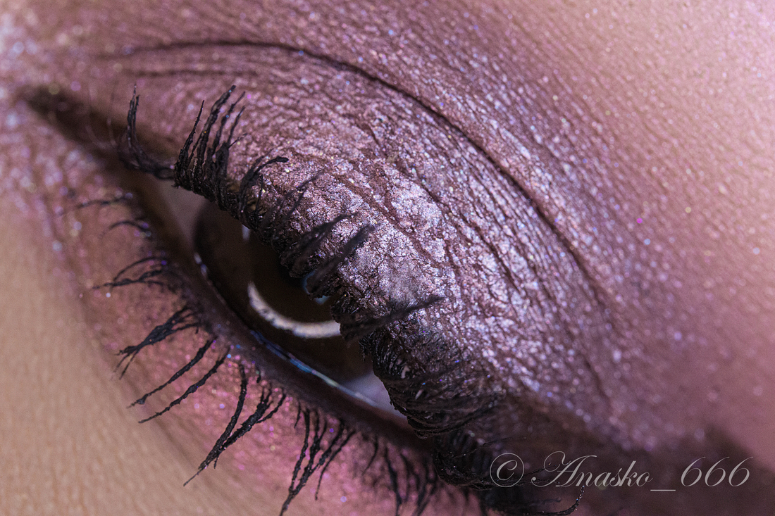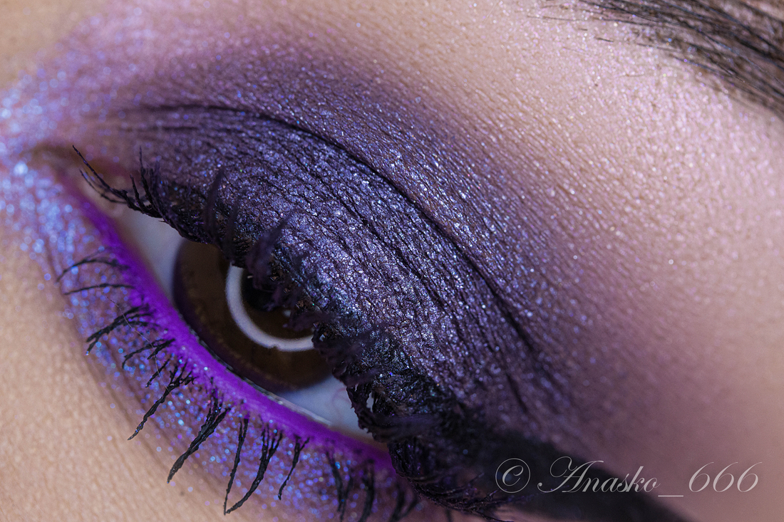 Сизо-синий сатин на фиолетовой базе, на макро можно разглядеть редкие включения серебряного шиммера, но в макияжах его не особо и видно.
