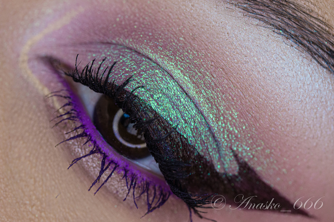 Дуохромный спаркл: бежевая база и пастельно бирюзовый шиммер. В макияжах может маскироваться под бежевое серебро.
