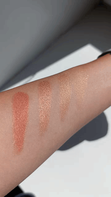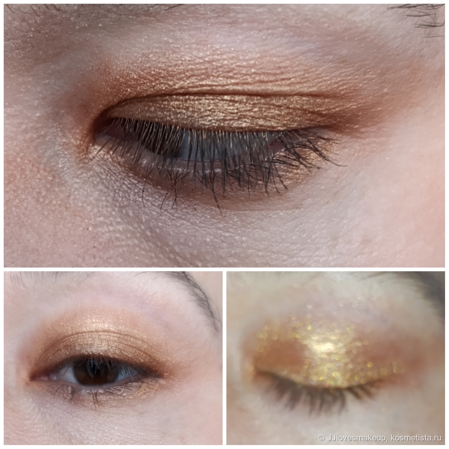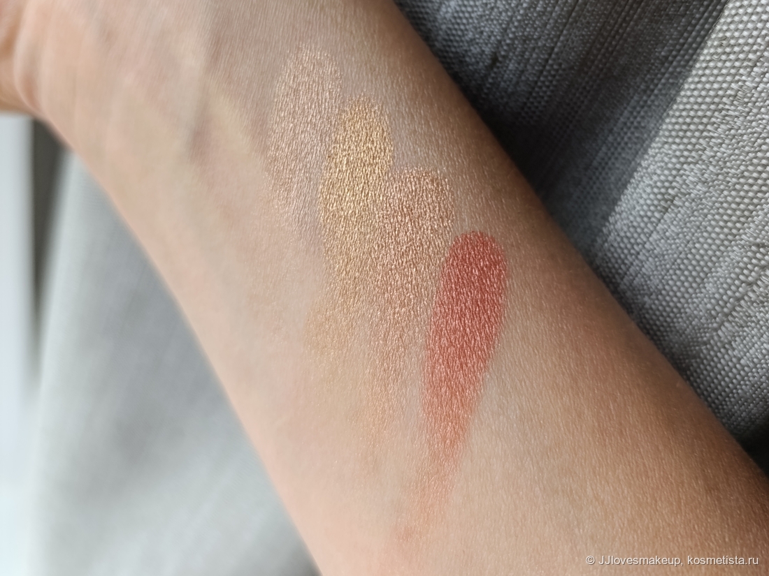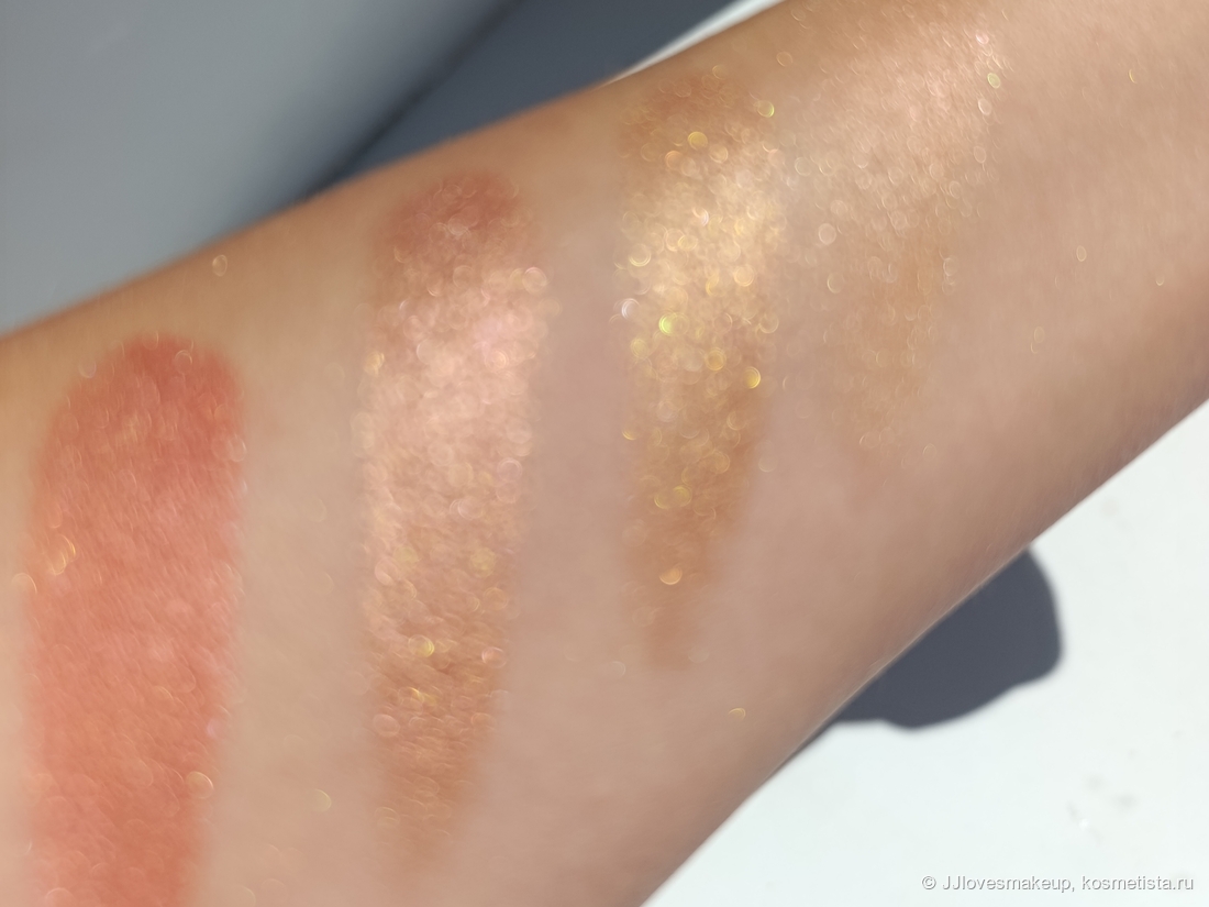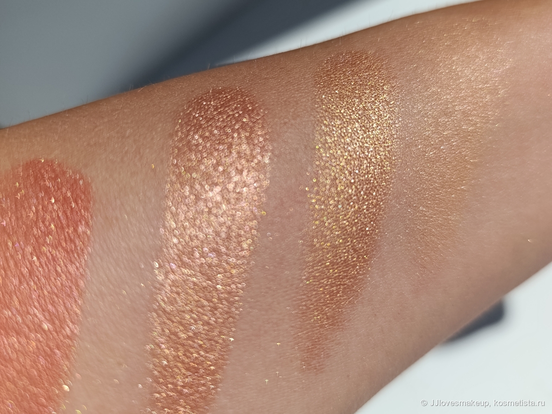 Шиммер/блестки/перламутр: на официальном сайте заявлено, что финиш у теней металлический, покрытие наслаивается (Finish: Metallic, Coverage: Buildable). Да, это действительно так, но металлический блеск слабый, ещё меньше, и был бы сатиновый, при вуально нанесении просто лёгкий блеск и цвет. Эффекта жидкого металла у теней нет (в отличие от того же золота от Natasha Denona). К тому же, самый светлый оттенок все же не металлический, а 100% сатин с блестками.