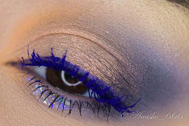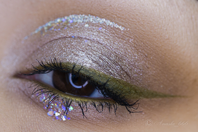 Крупный шиммер или мельчайшая слюда, переливом похож на предыдущий: шифт из зеленого в фиолетовый. Мне перелив показался менее явным, более трудноуловимым на фото, но в динамике пигмент сверкает и переливается вполне себе эффектно. На фото как могла попыталась это передать, надеюсь это получилось. Наношу пигмент только на липкую базу. В зависимости от интенсивности липкого слоя пигмент можно нанести как легкими искрами, так и более плотно.