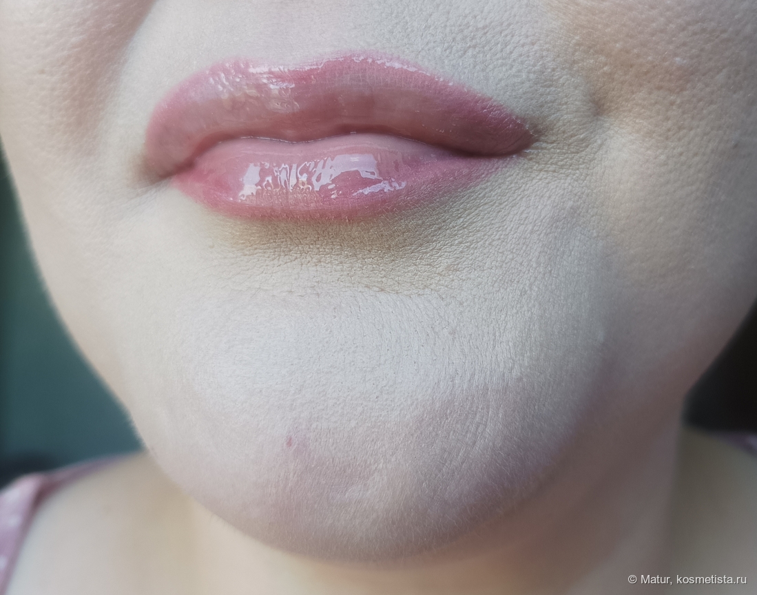 Аккуратность с этим оттенком необязательна и это плюс к карме. Далее добавляю прозрачное масло с мельчайшими золотыми частицами и получаю не слишком яркий, но тем не менее заметный макияж губ