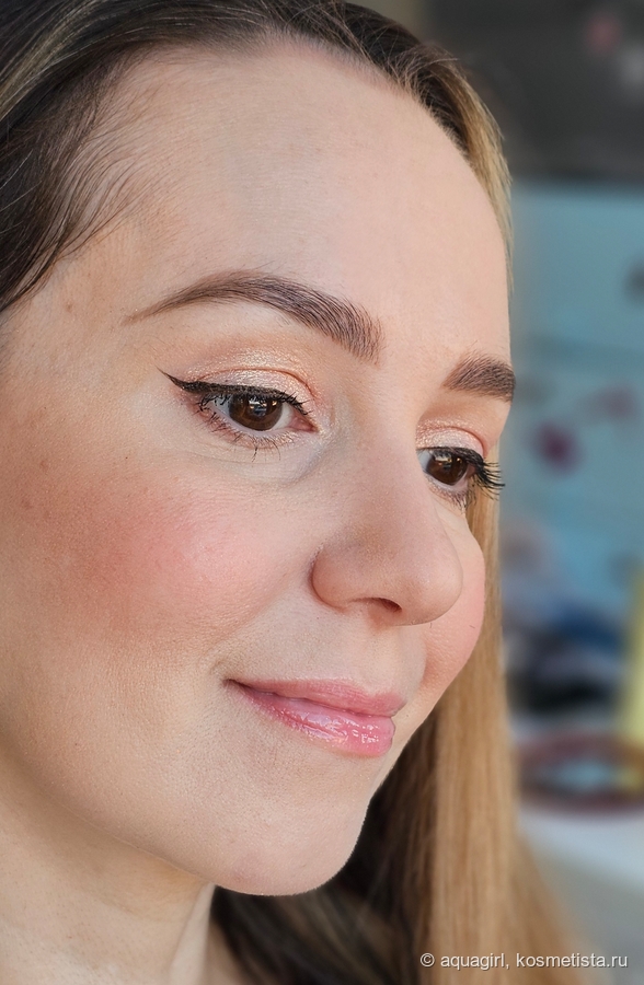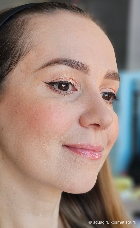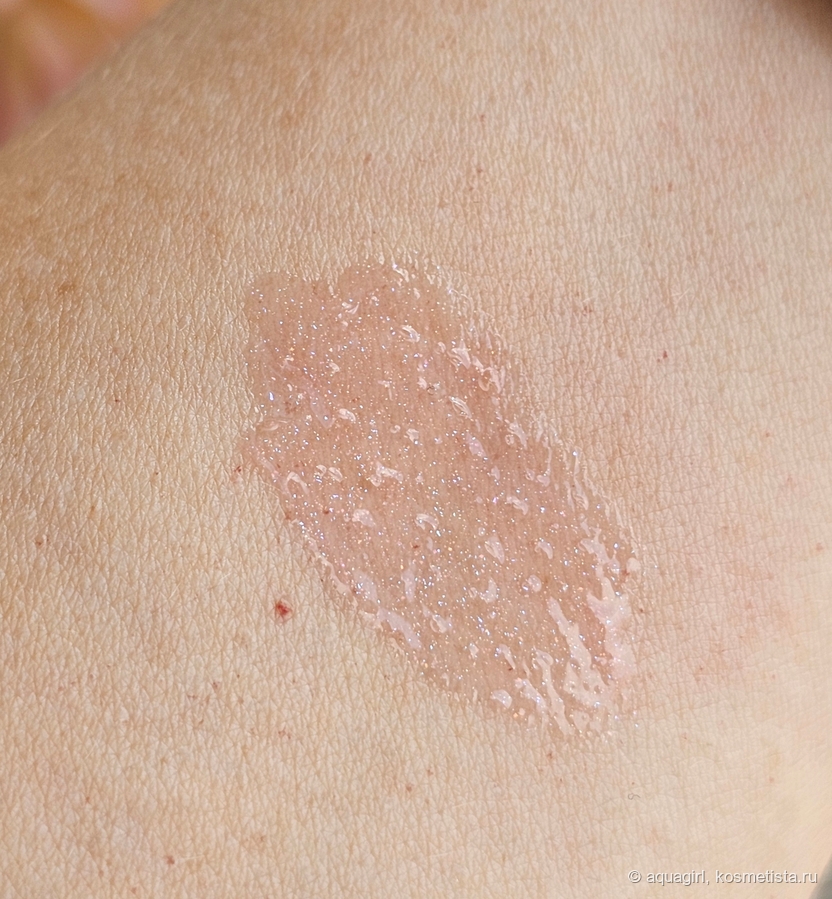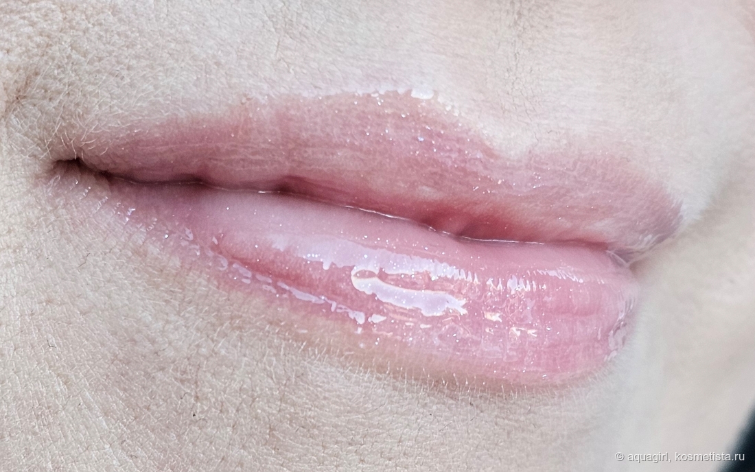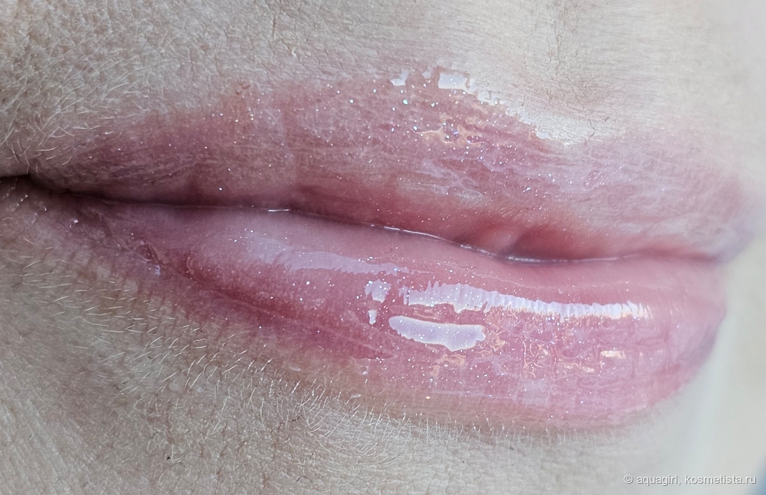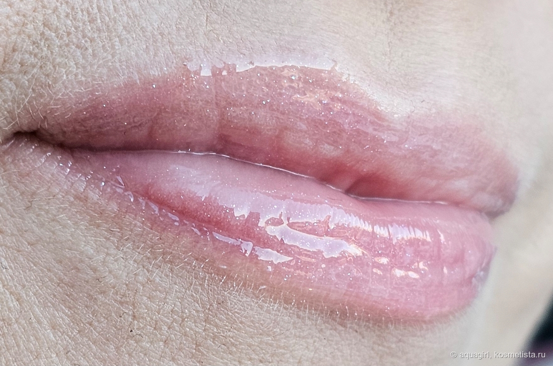 Текстура блеска не текучая, он хорошо держит контур. Слегка липковат, но для меня это скорее плюс — такие блески обычно более стойкие и лучше увлажняют.