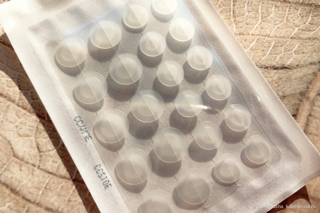 Сами по себе патчи прозрачные. Без первичной упаковки занимают мало места. Внутри находятся 22 патча, среди которых есть размер на 12 и 10 мм. При выборе патча, я отдаю преимущество круглым, потому что я не очень люблю инородный объект на теле, а тут ещё и 8 часов необходимо проносить, поэтому при чувстве дискомфорта, подколупываю его ногтём. Круглая версия не быстро сдается, поэтому для меня более привлекательна.