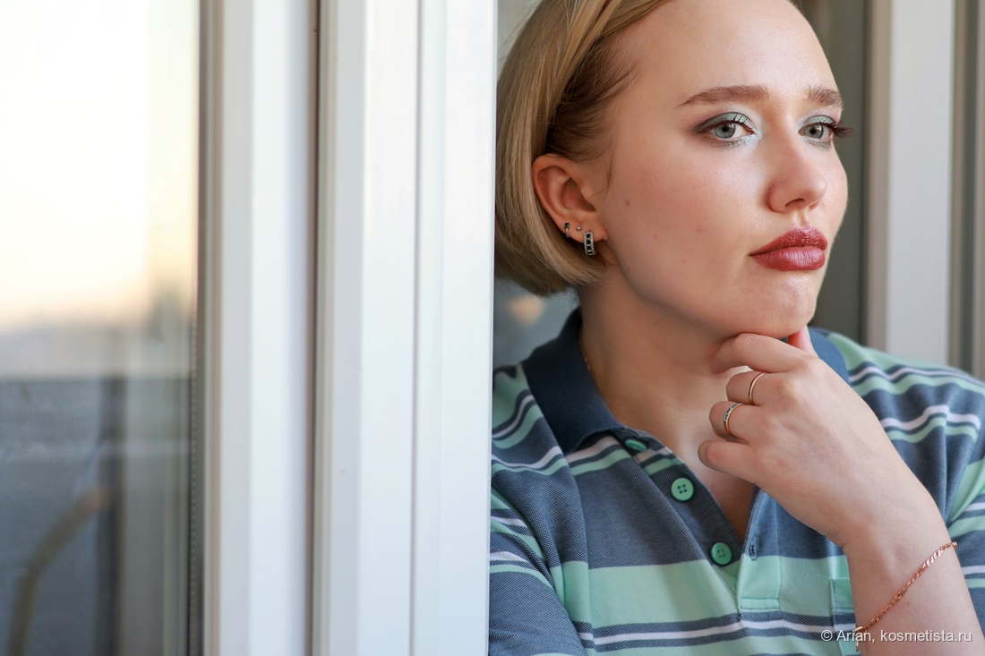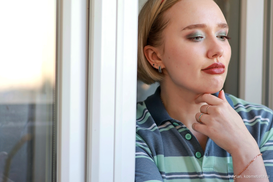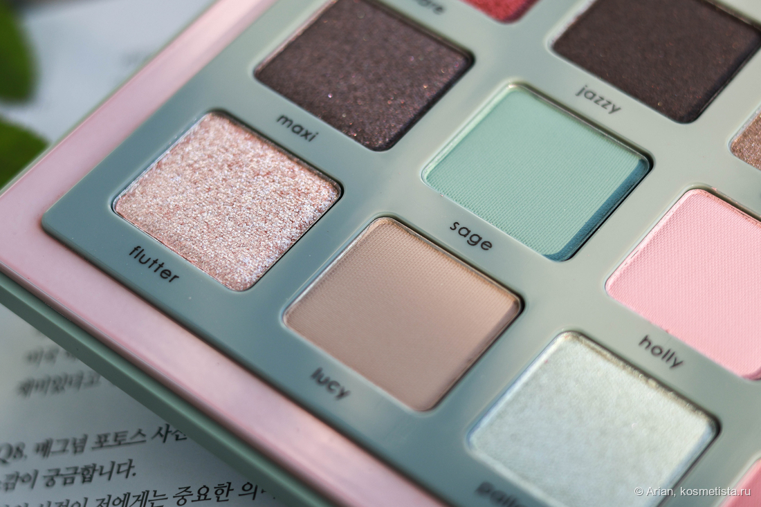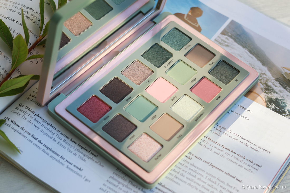 Палетка, как и большинство у бренда, коммерческая. Поэтому гамма здесь довольно стандартная — с коричневыми, розовыми и золотистыми тенями. Однако есть и мятные с тиловыми, которые Наташа посчитала ретро.