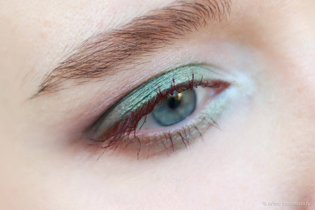 - evergreen — болотный тиловый околоматовый оттенок. Наташа такие тени считает кремовыми, но рефил скорее сухой (как и аналогичные в пастельной палетке, например). Не самый удобный для меня оттенок, но всё же не сложный в использовании.