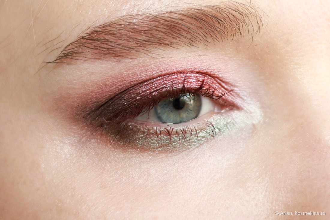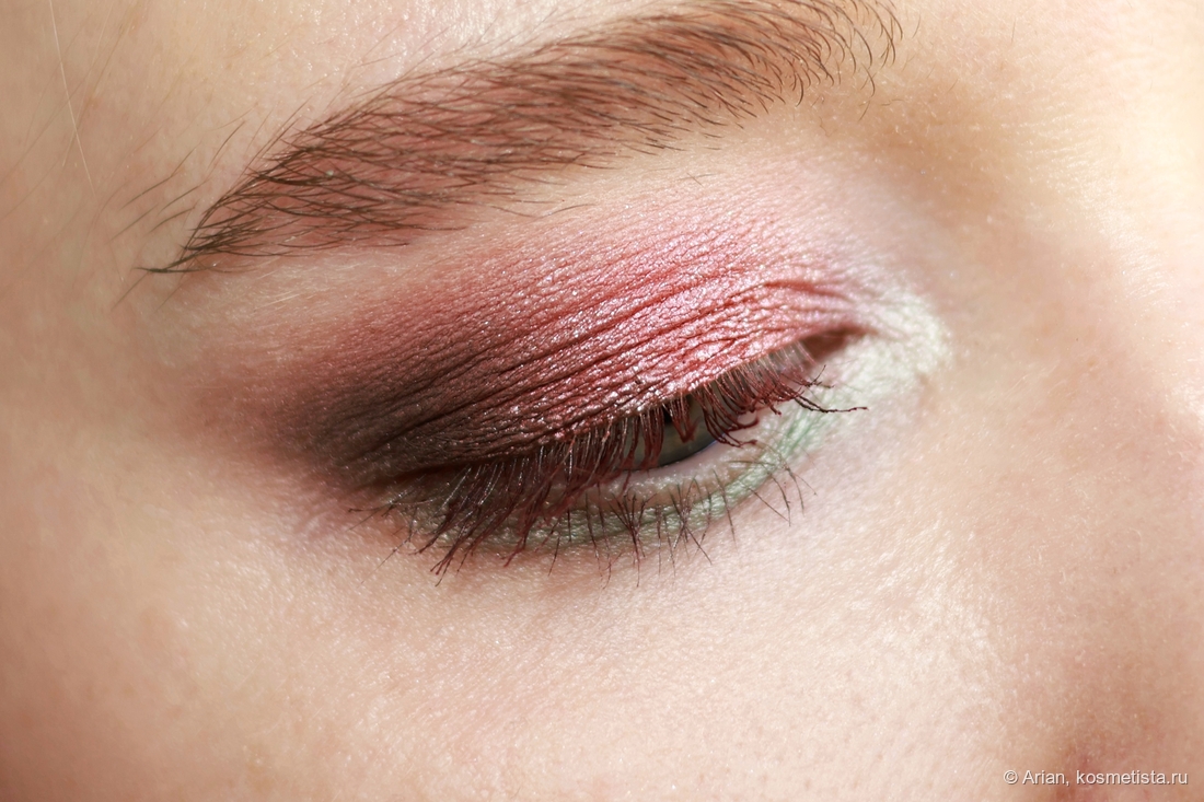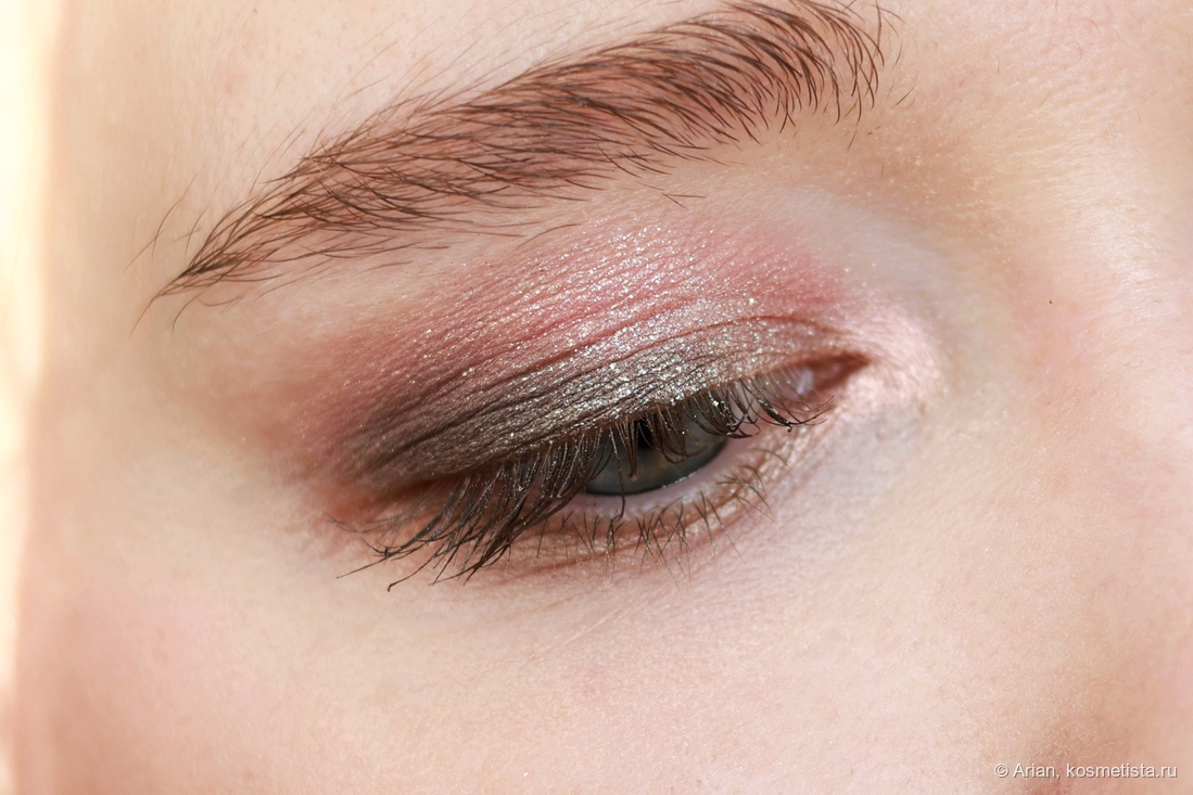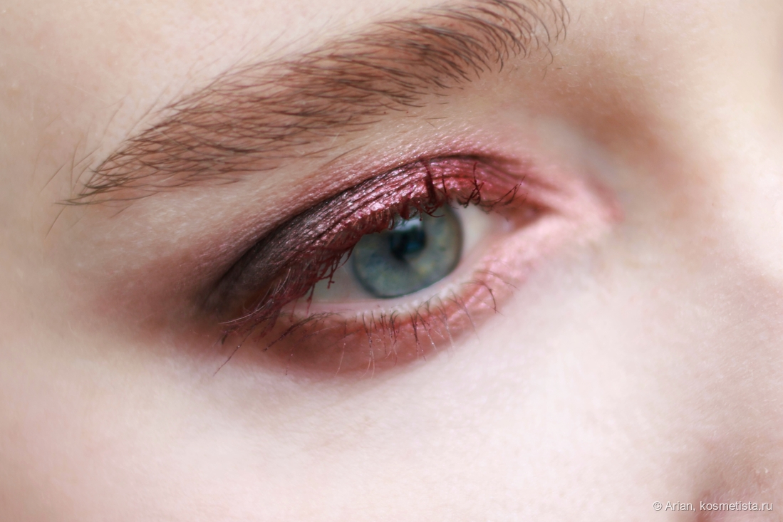 - flare — розовато-красный с серебристым шиммером, выглядит как глазурь. Наносится неплотно, эффект на веках даёт приглушённый. С т/х проблем не было.