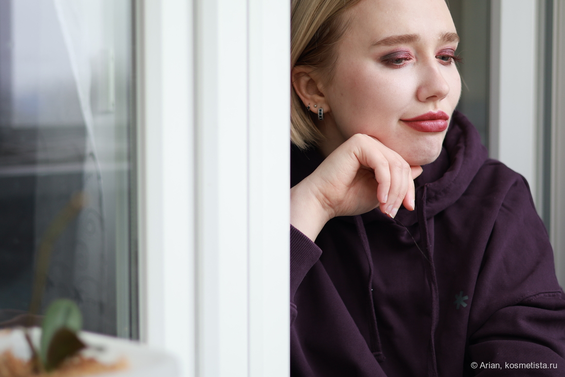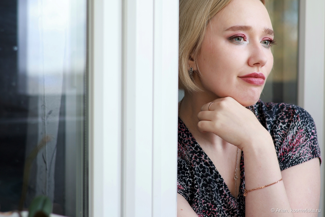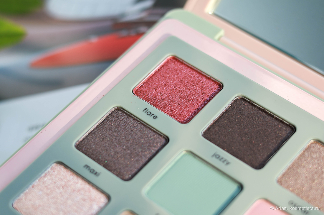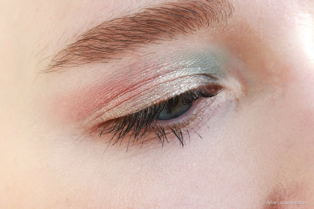 - flare — розовато-красный с серебристым шиммером, выглядит как глазурь. Наносится неплотно, эффект на веках даёт приглушённый. С т/х проблем не было.