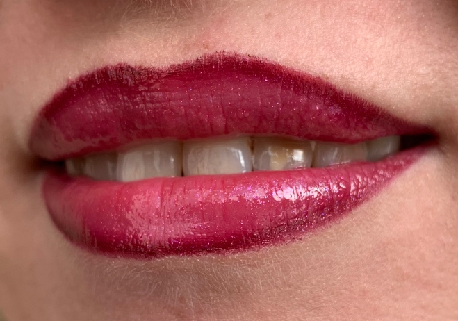 06 оттенок, Bitе — это полупрозрачный блеск с большим количеством шиммера и темно-розово-бордовый карандаш.