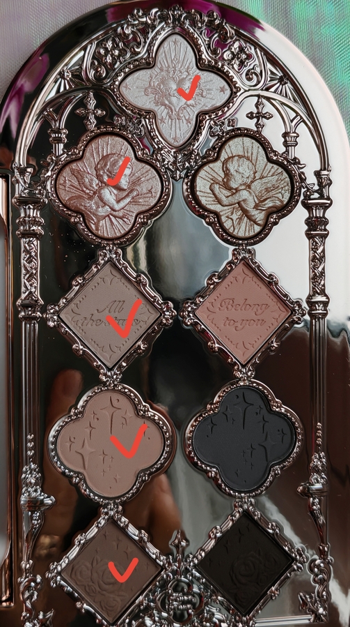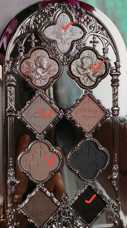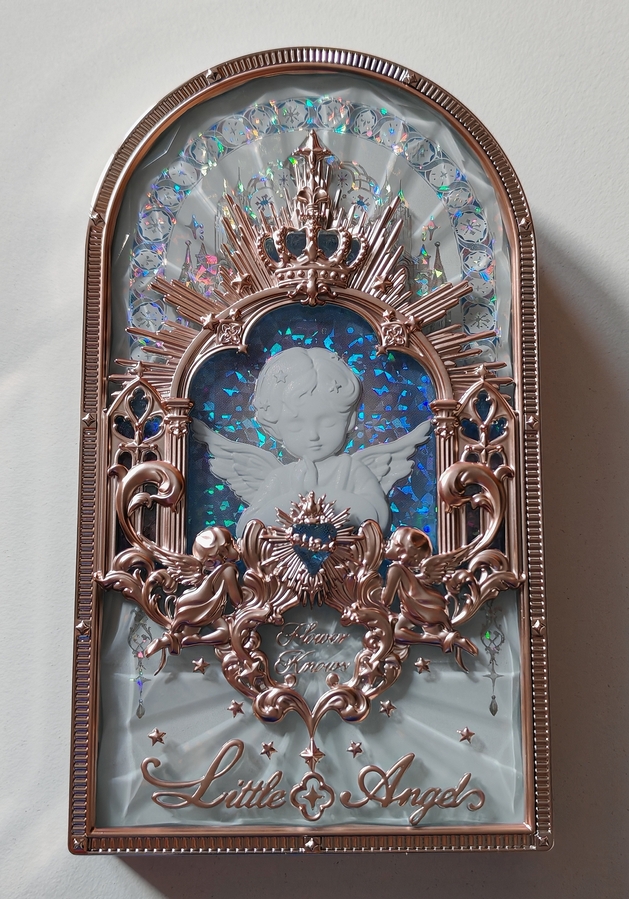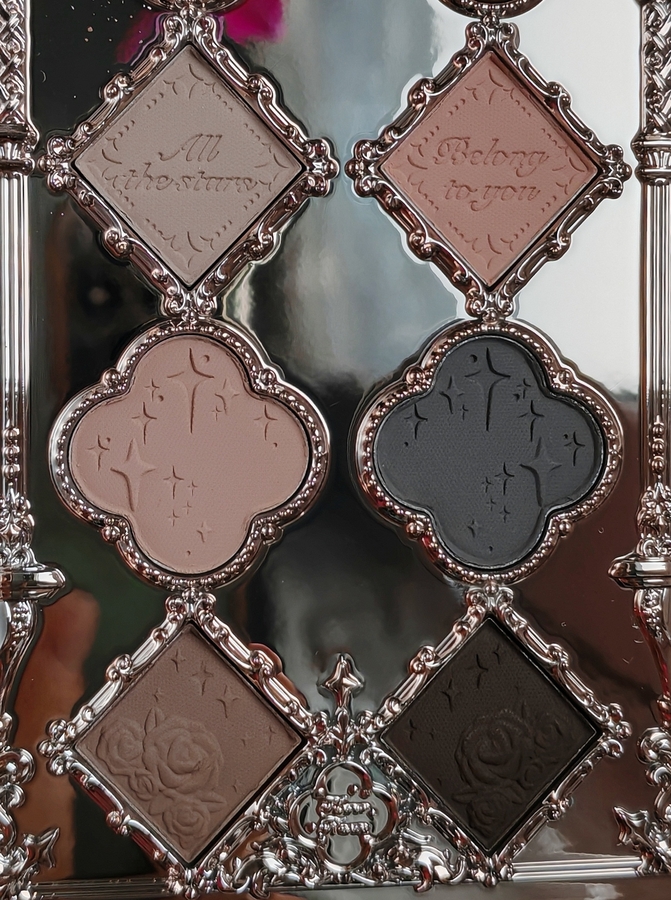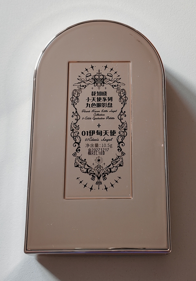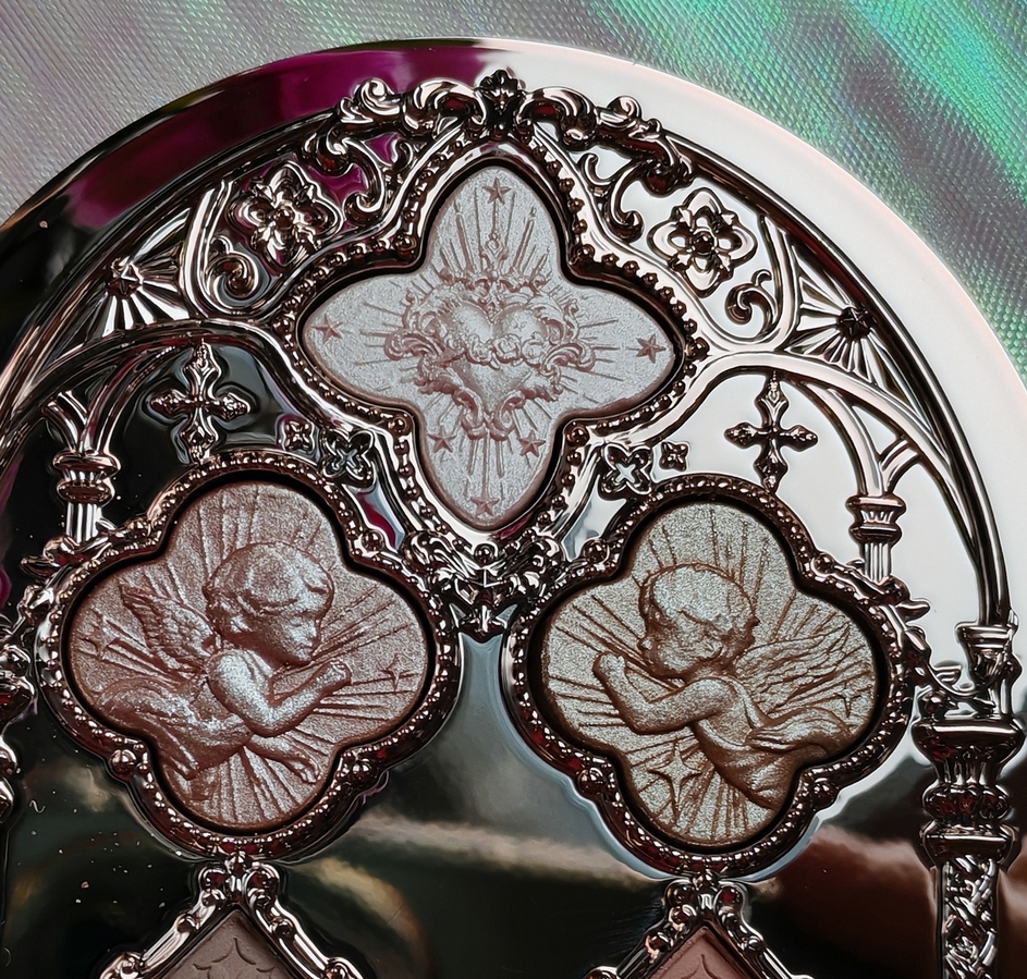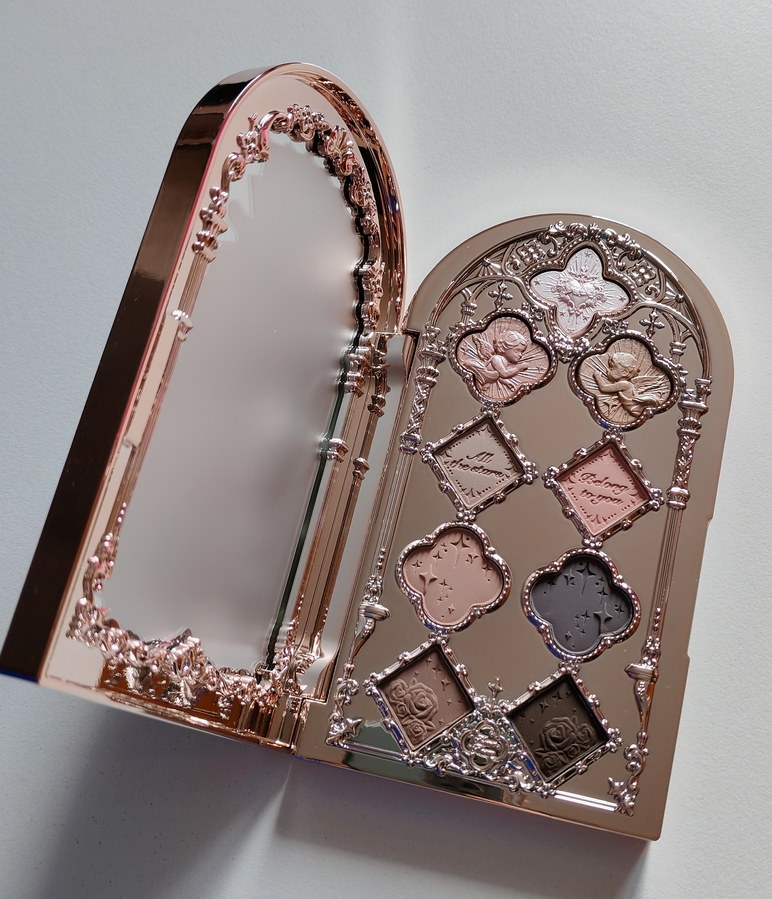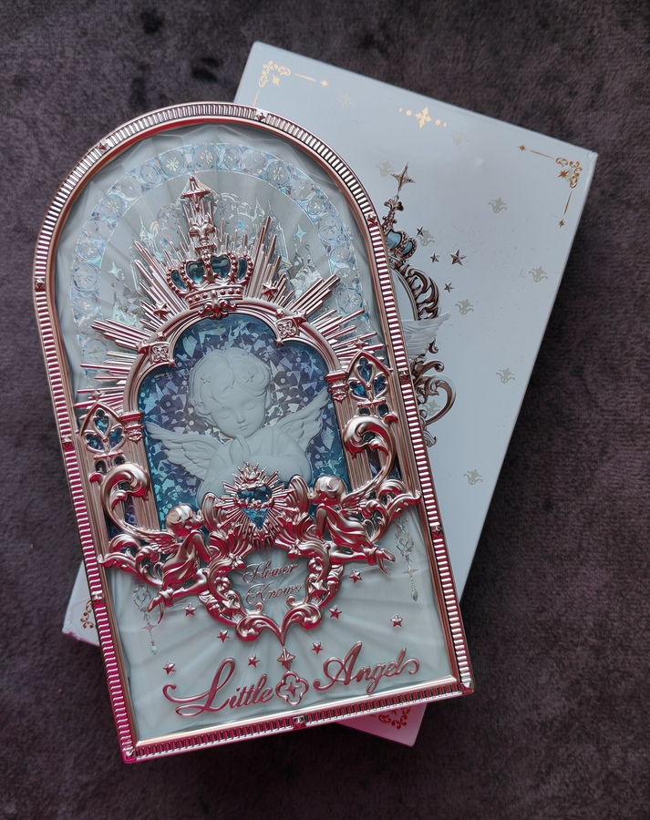 Оформление — ну просто загляденье… Все детали проработаны. Как будто ангел смотрит в окошко, а вокруг него всё сияет и переливается. Создаётся ощущение, что палетка светится. Красота. Я могу любоваться ей долго.