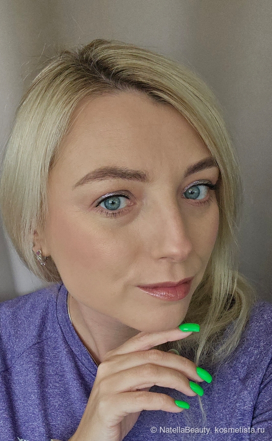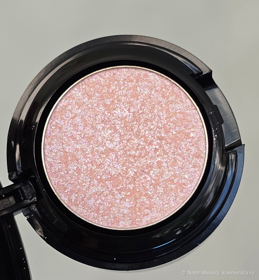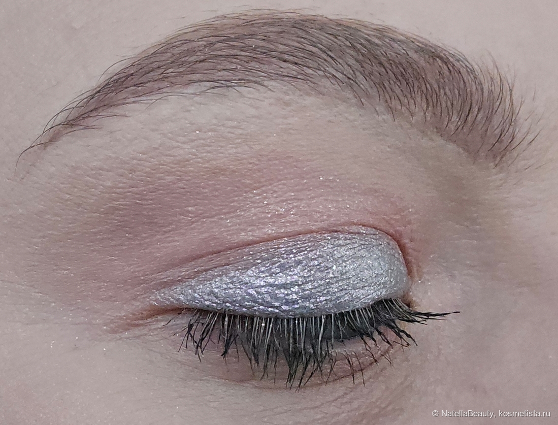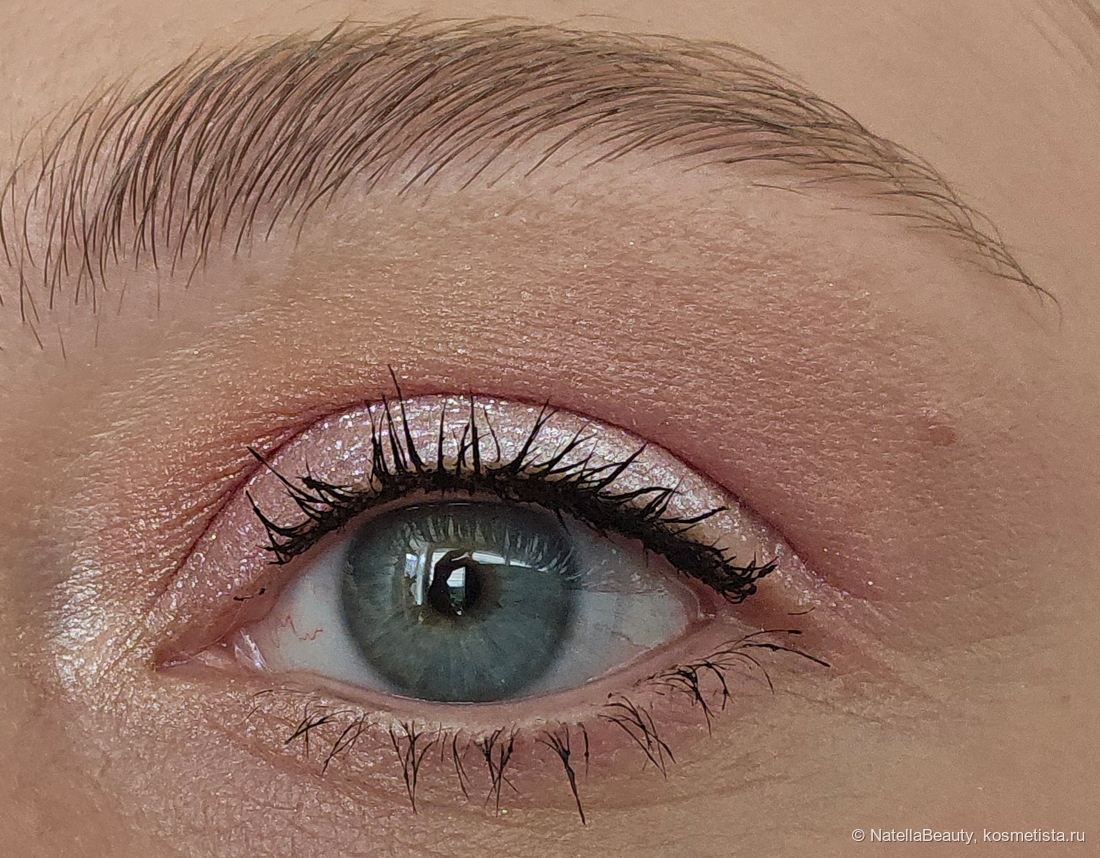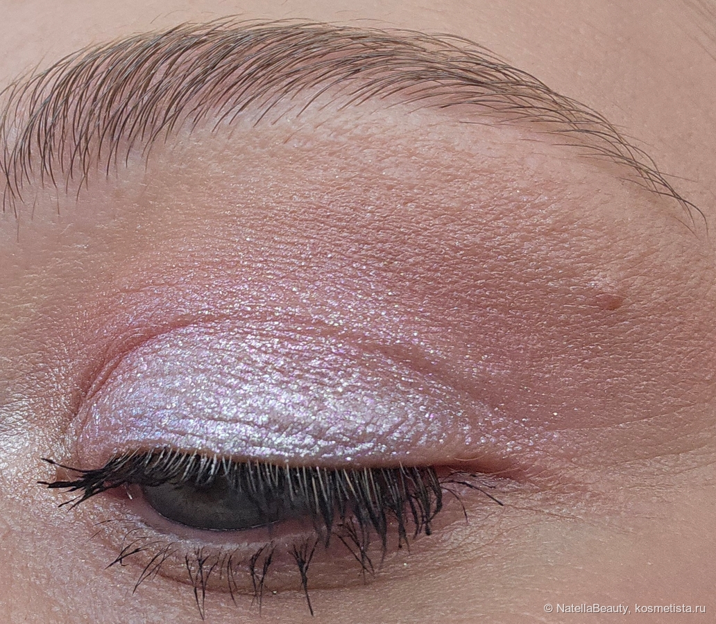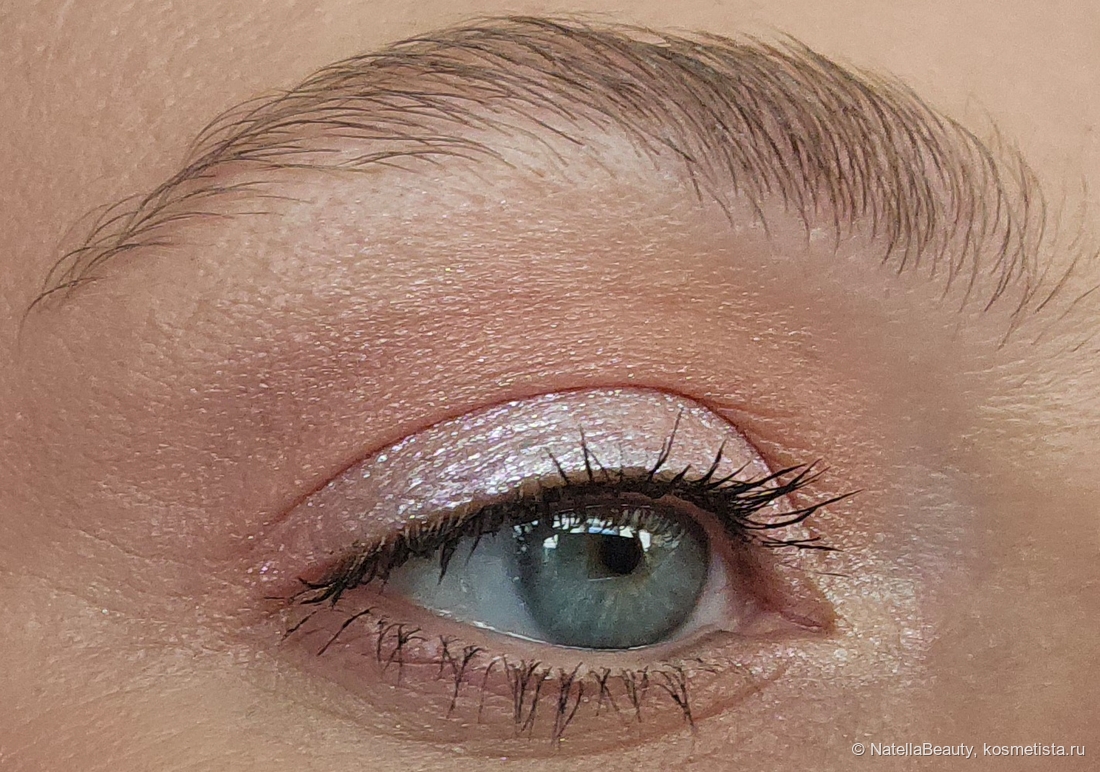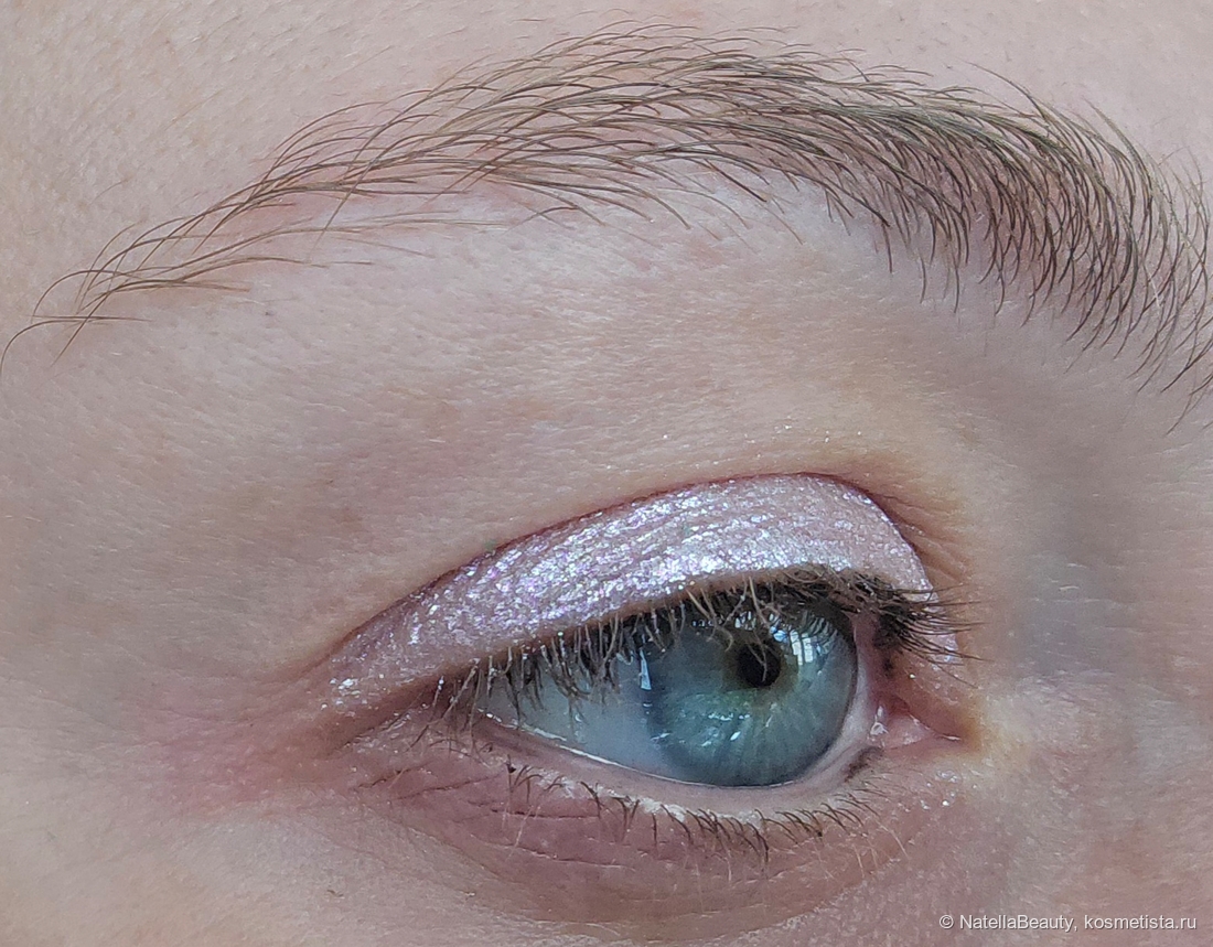 Текстура тонкая, без явных блесток, легко распределяется по коже век и не подчеркивает рельеф, не стягивает веко.