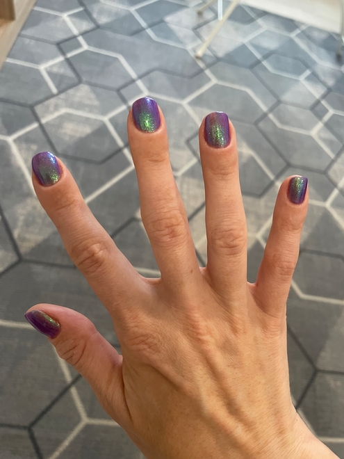 Цвет: яркий неоново-зеленый с сине-фиолетовым шиммерным сиянием.