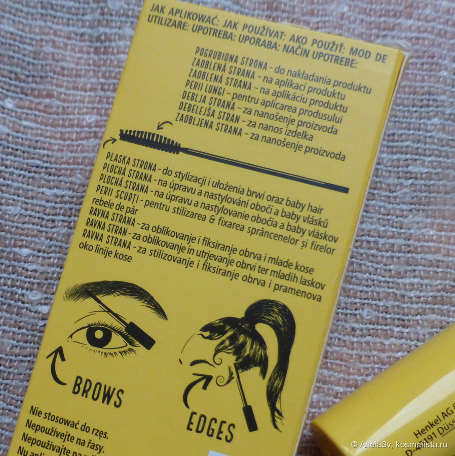 По задумке производителя, этот гель создан не только для бровей, но и для приглаживания мелких волосков пробора, чтобы причёска выглядела максимально аккуратно. Я же наношу его исключительно на брови. У средства яркий, заметный жёлтый флакон, объём которого — целых 16 мл, что в несколько раз превышает стандартные тюбики с гелями для бровей. На упаковке отдельным пунктом отмечено: на ресницы продукт наносить нельзя.