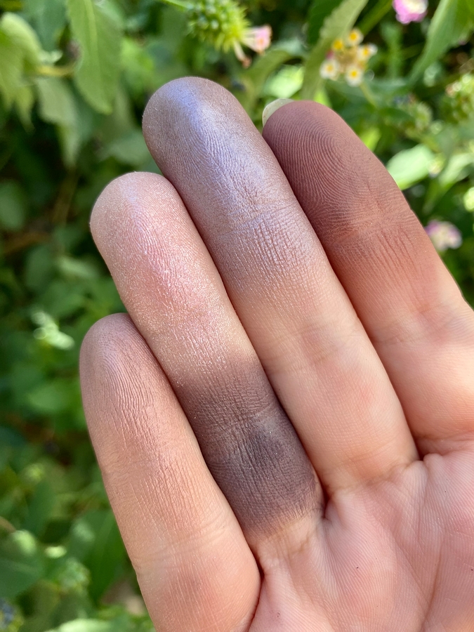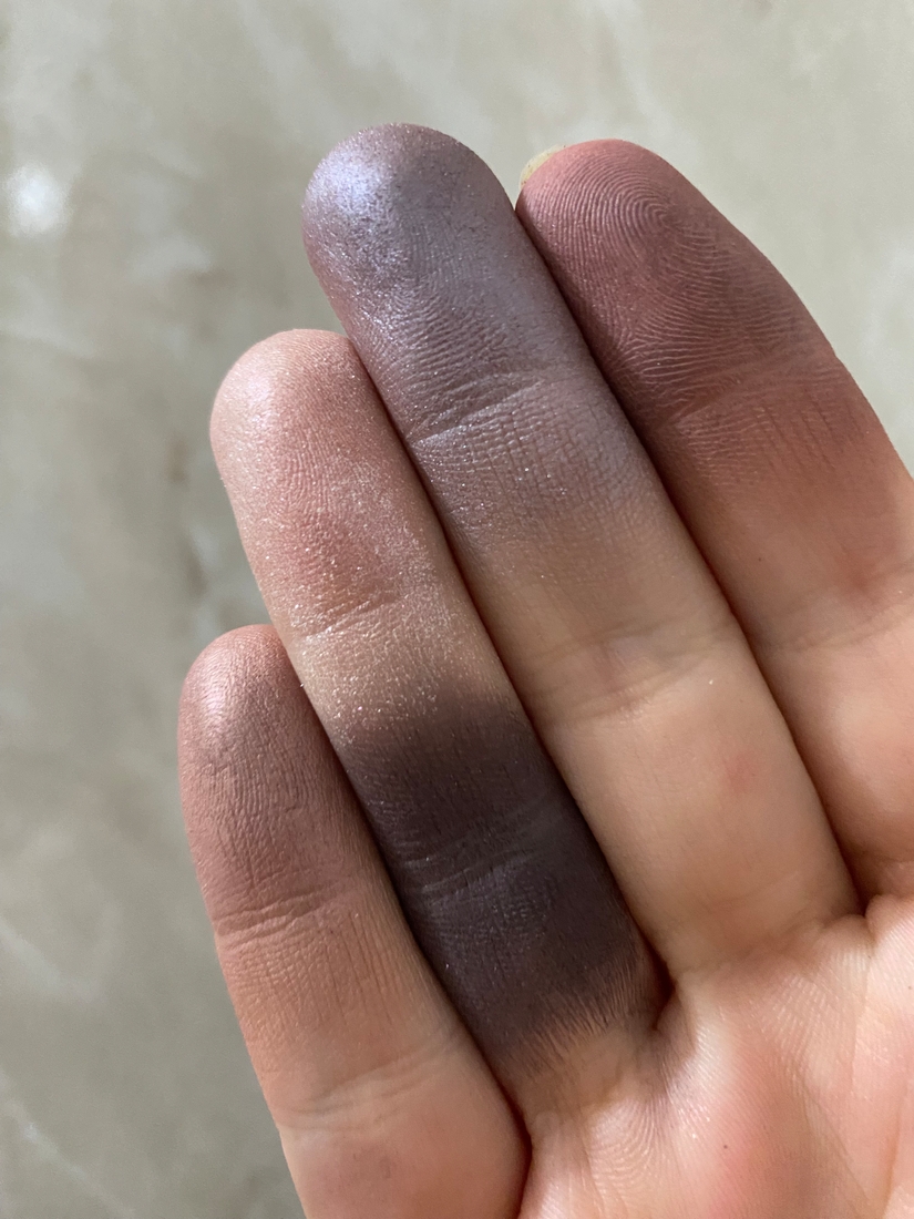 Второй оттенок сверху (мой четвёртый палец) — блески для тех, кто боится блесток 😁 Еле заметные искорки на мучнистой базе, которые лучше видно на подложке из темных теней, чем на голом веке. Для меня — провальный оттенок.