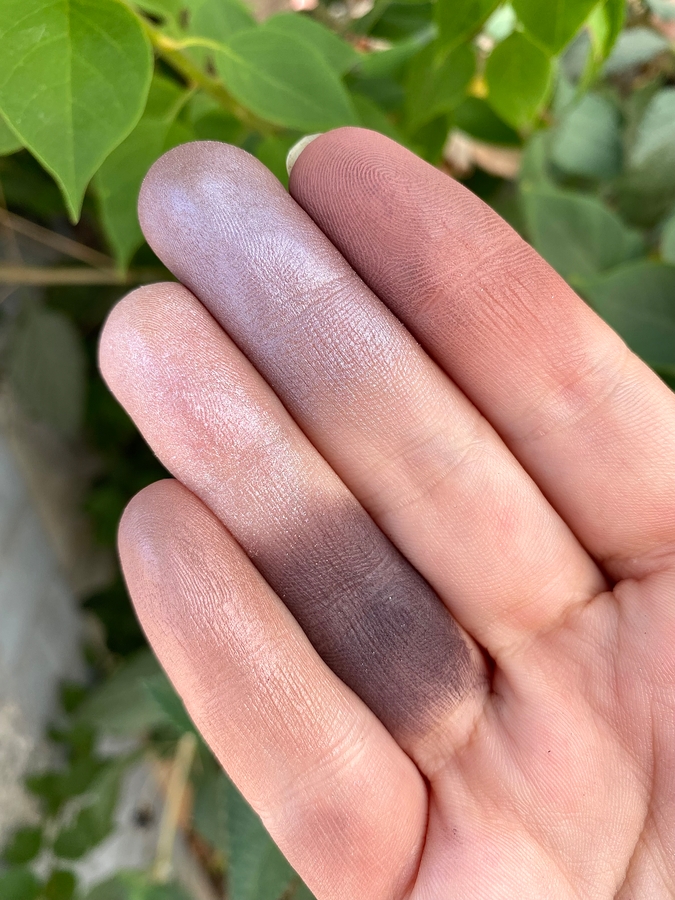 Второй оттенок снизу (нижняя фаланга моего четвертого пальца) — нормальный коричневый 😂👍 без этих полутонов и полунамеков. Сложный, шоколадный оттенок с легкой нотой серого, который его делает «припыленными шоколадом», который на веке видно, затемнить им можно и наслоить тоже, не стирая рефилл в ноль.