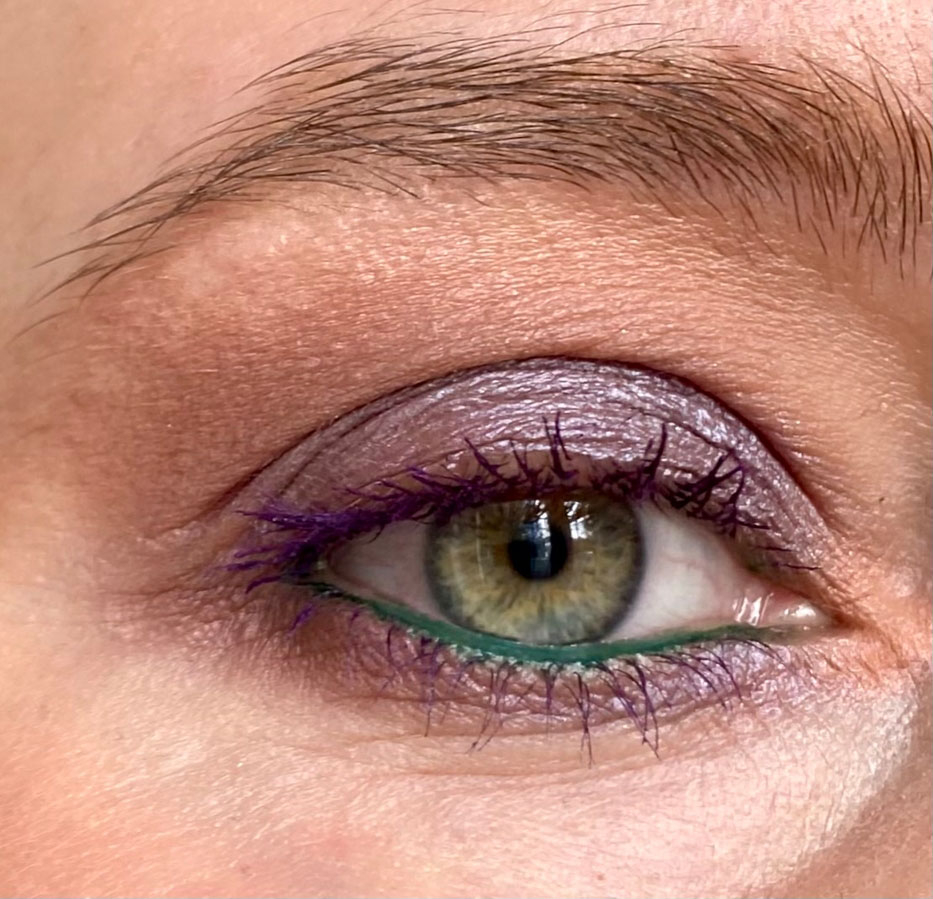 лилово/ серебряный сатин. Дневной оттенок, который будет смотреться в вечернем свете не очень ярко и не очень презентабельно, будет уходить в серый. Лучше использовать его днем. Так он будет смотреться гораздо выигрышнее. Оттенок — полупрозрачный и нужно его хорошенько наслаивать, чтобы его было видно и он заиграл.