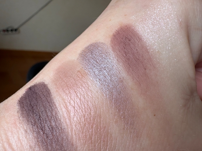 Вот, уже на этапе свотчей я напряглась… И как такая нежнятина будет смотреться на веке? Я не люблю полупрозрачные тени, где непонятно, ты накрашена или сама такая красивая. Я такие макияжи делаю редко и в большом количестве подобных теней не нуждаюсь. Порадовал темный матовый. Он сразу показал свой пигмент, а мучнистый оттенок шампанского меня приготовил к той самой неоднозначности формулы теней.