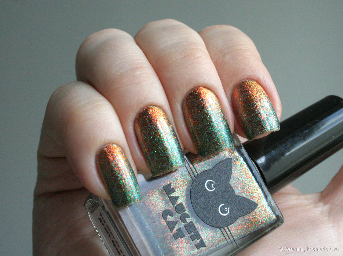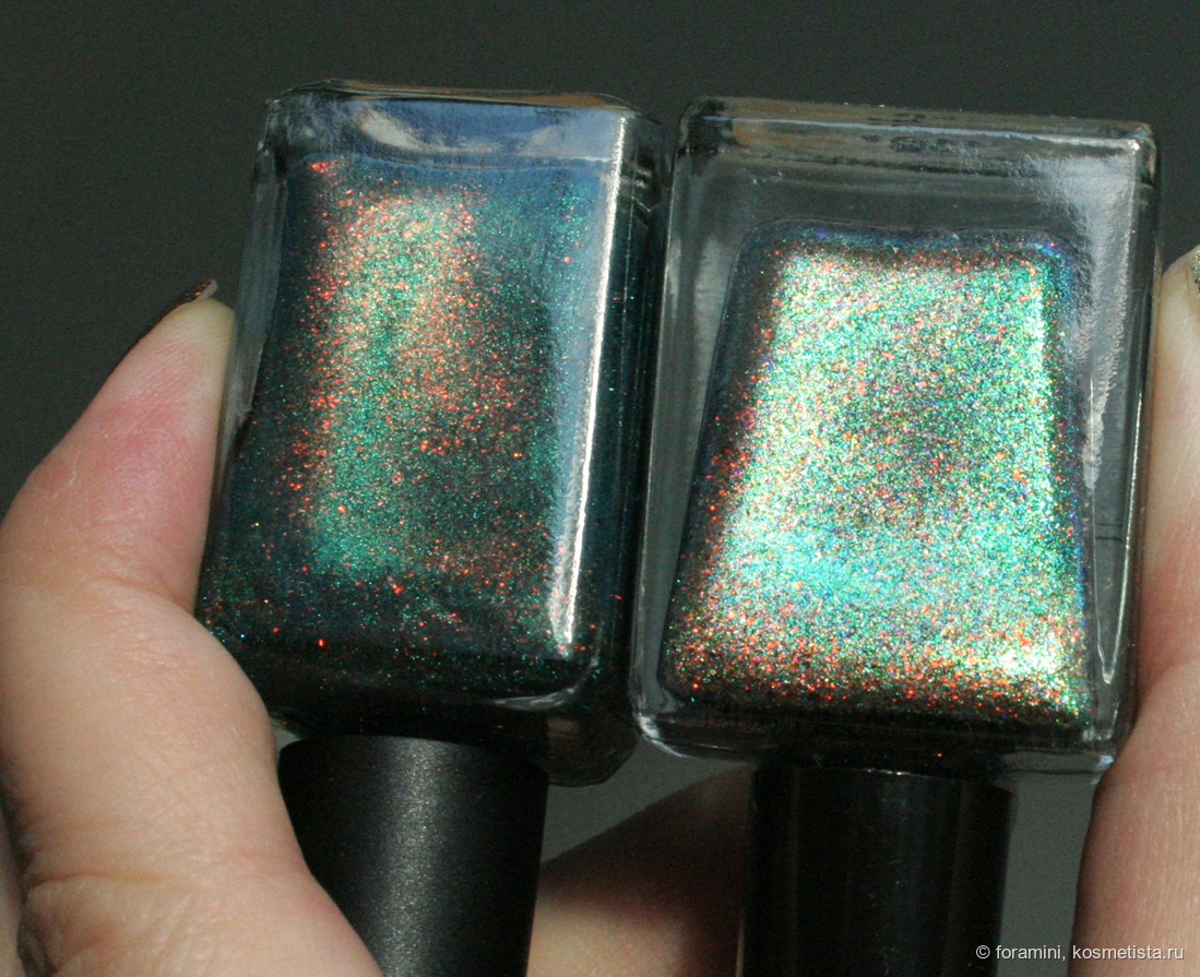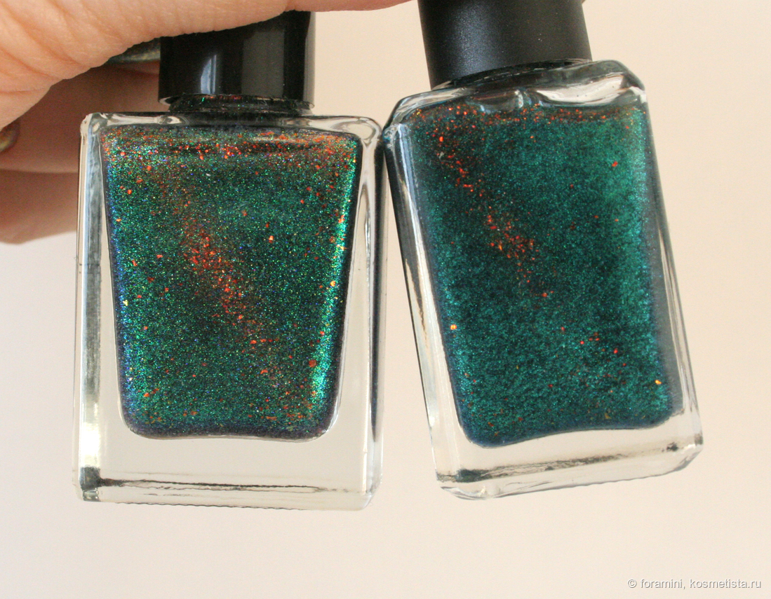 У меня они есть оба, могу показать разницу: у Cadillacquer более синяя база и состоит из шиммера одного сине-зеленого цвета, тогда как в Naughty cat наполнение из смеси двух шиммеров, синего и зеленого. Оранжевые хлопья в бутыльке магнитятся хуже в Cadillacquer, но при нанесении на ногти я разницы не заметила.