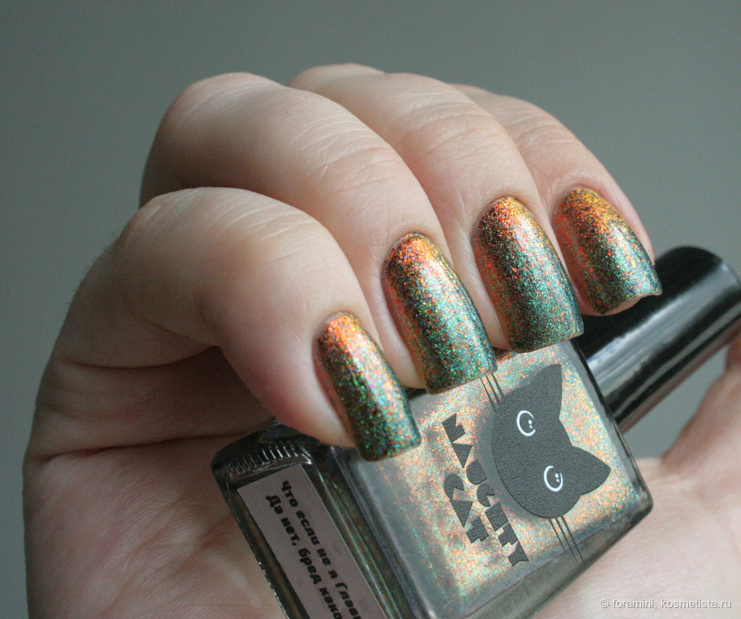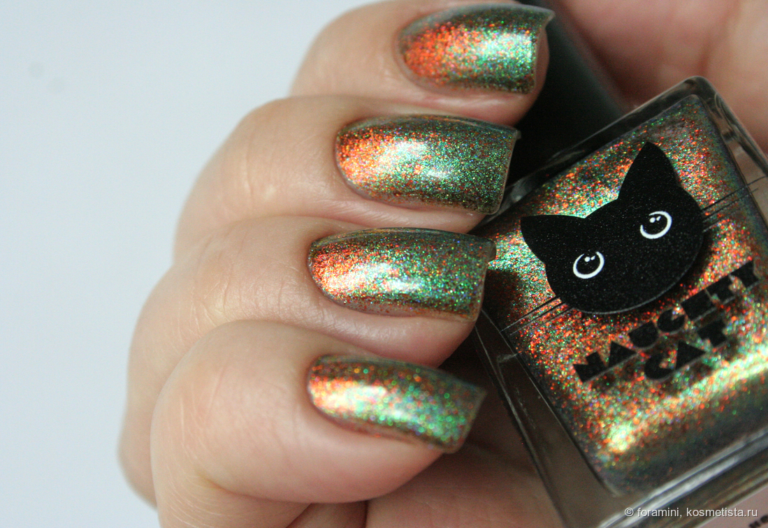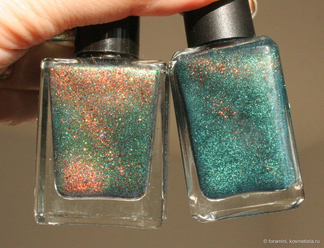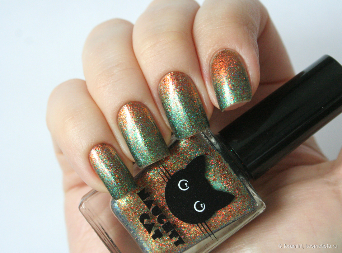 У меня они есть оба, могу показать разницу: у Cadillacquer более синяя база и состоит из шиммера одного сине-зеленого цвета, тогда как в Naughty cat наполнение из смеси двух шиммеров, синего и зеленого. Оранжевые хлопья в бутыльке магнитятся хуже в Cadillacquer, но при нанесении на ногти я разницы не заметила.