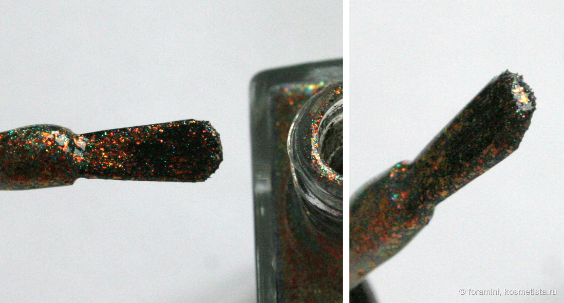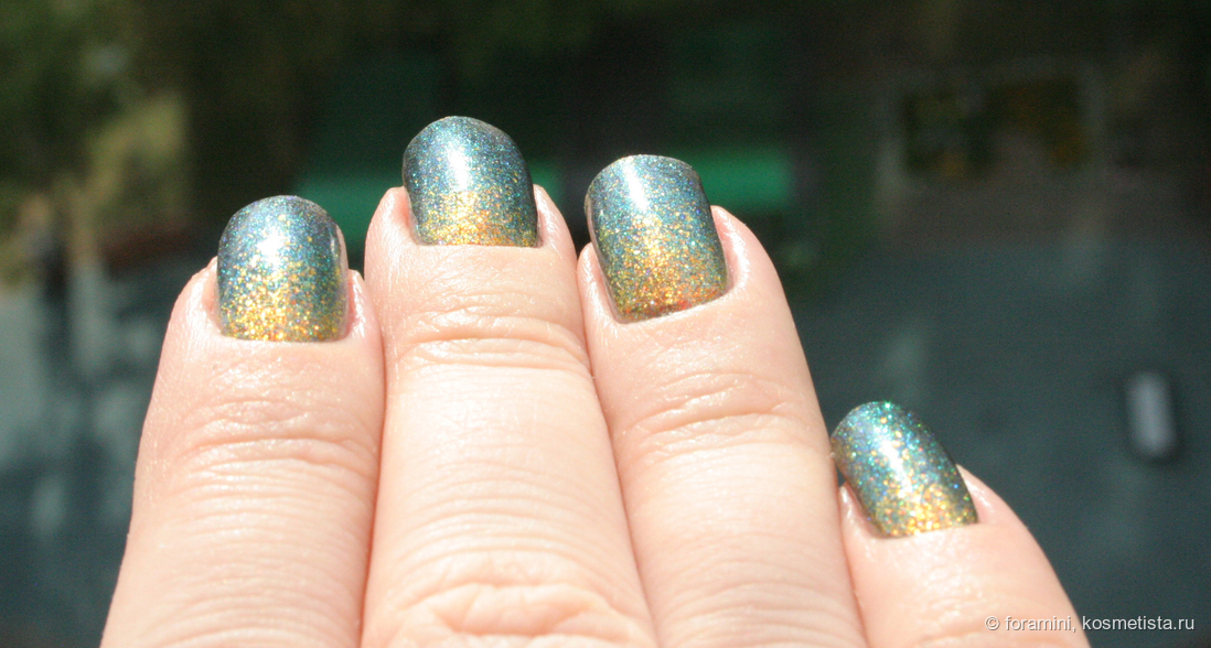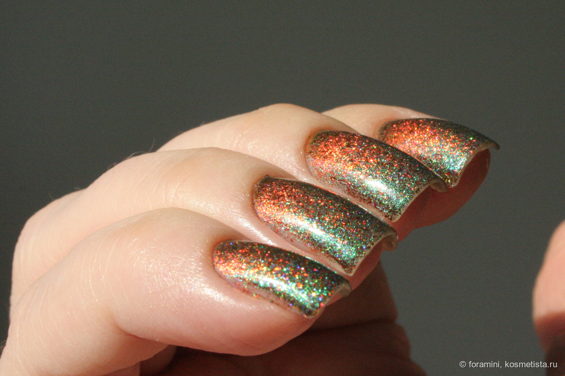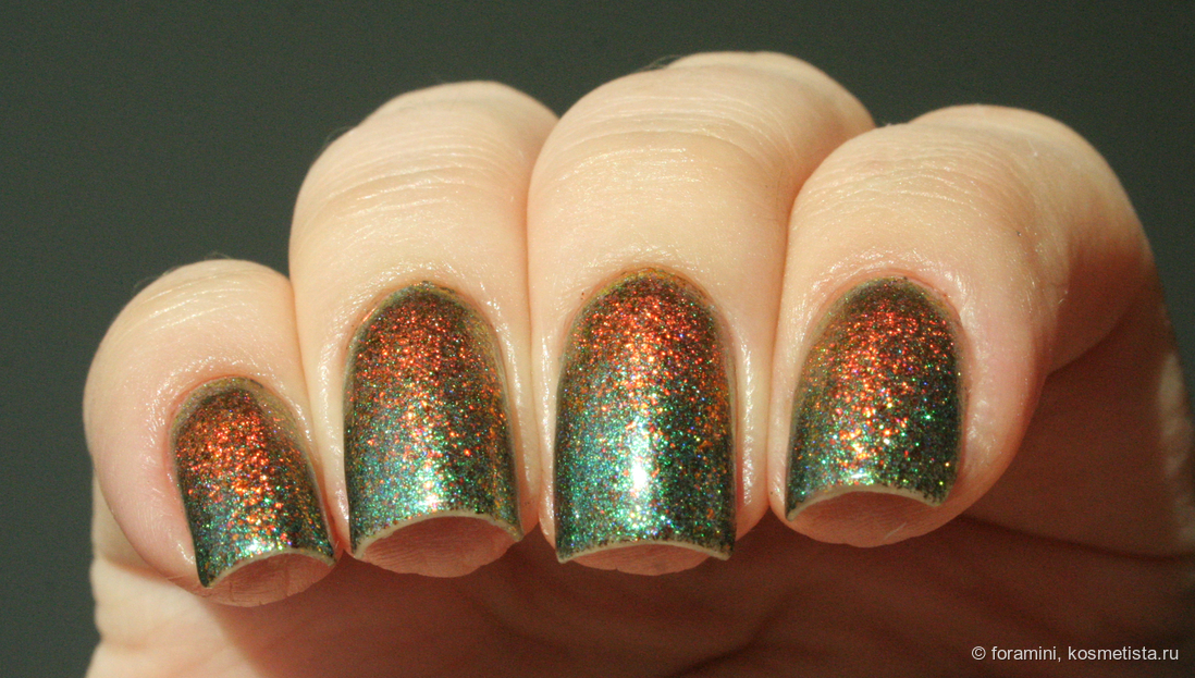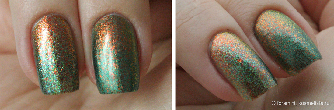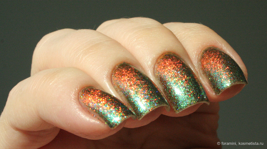В лаке прозрачная база с наполнением из металлизированных оранжевых хлопьев и смеси синего и зеленого шиммера, имеющего металлический блеск.