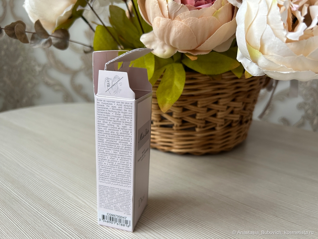 Оформление у масла в стиле линейки Miss Dior — белая картонная коробка с серым окошком и надписью Miss Dior, внутри — культовый вытянутый кирпичиком флакон светло-розового цвета (слава Богу, с линейкой ароматов не спутаешь) с украшением в виде «гусиной лапки» по бокам флакона с матовой отделкой. Тактильно очень приятно, да и зрительно выглядит очень эстетично. Одно из отличий бутылочки линейки Miss Dior — отсутствие бантика на горлышке. Кнопка-спрей металлическая, с логотипом марки CD.