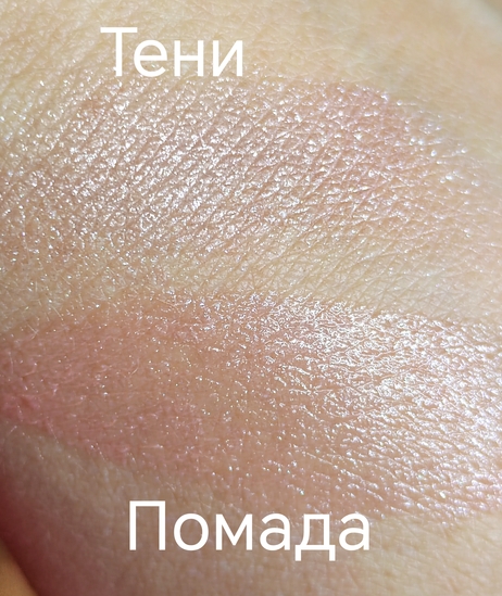 Для наглядности, вот фото свотчей, где сверху тени от ND оттенок Mia (спаркл), а внизу — данная помада: