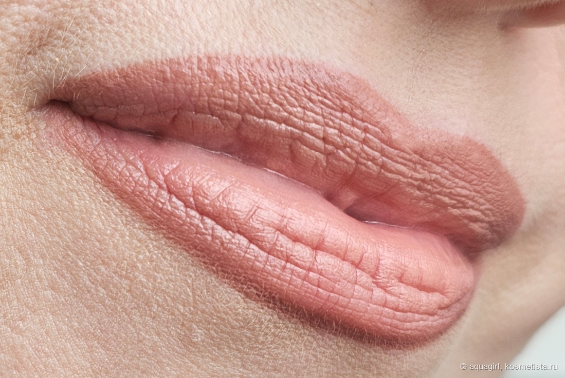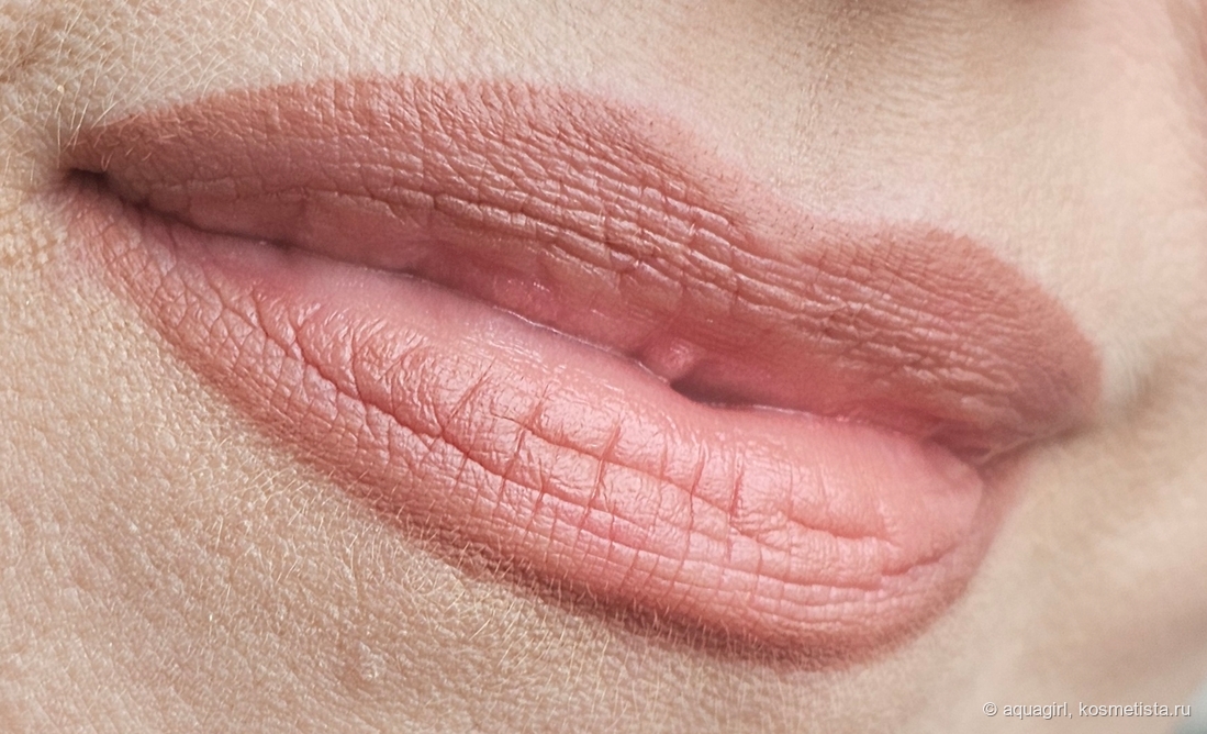 Текстура карандаша мягкая, кремовая. Он легко скользит по коже, рисует аккуратную и очень стойкую линию. При нанесении на всю поверхность губ практически не сушит. Точнее, сушит ровно настолько, насколько положено карандашу. При очень сухих губах сверху стоит добавить каплю блеска, но я обхожусь без него.