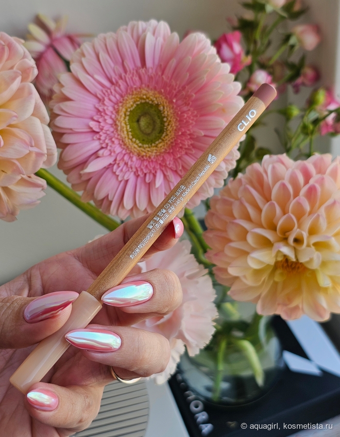 Карандаш Clio по контуру и поверхности губ. Пользоваться им очень приятно, он мягкий и нежный.