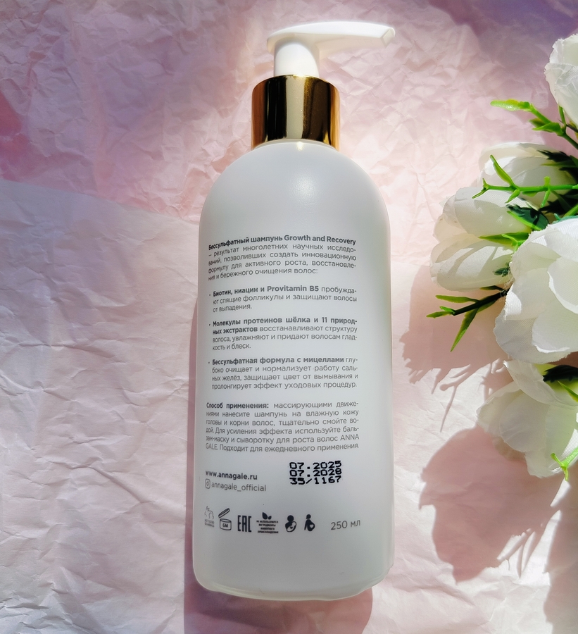 Мне очень понравились волосы после шампуня Growth & Recovery от Anna Gale. Длина после смывания мягкая, не пересушенная, а наоборот увлажнённая и напитанная, волосы не путаются.