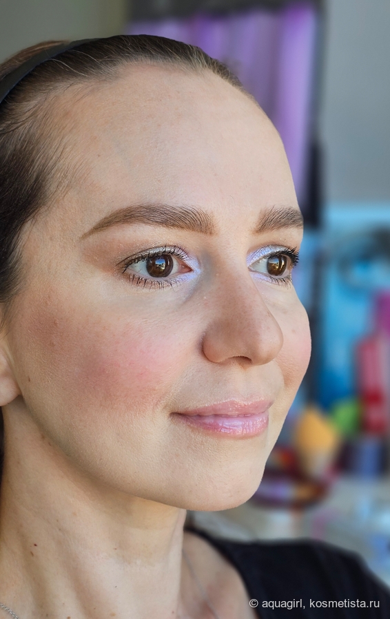 Оттенок — прозрачный сливочно-розовый с лёгким голубым переливом. В упаковке блеск кажется просто розовым.
