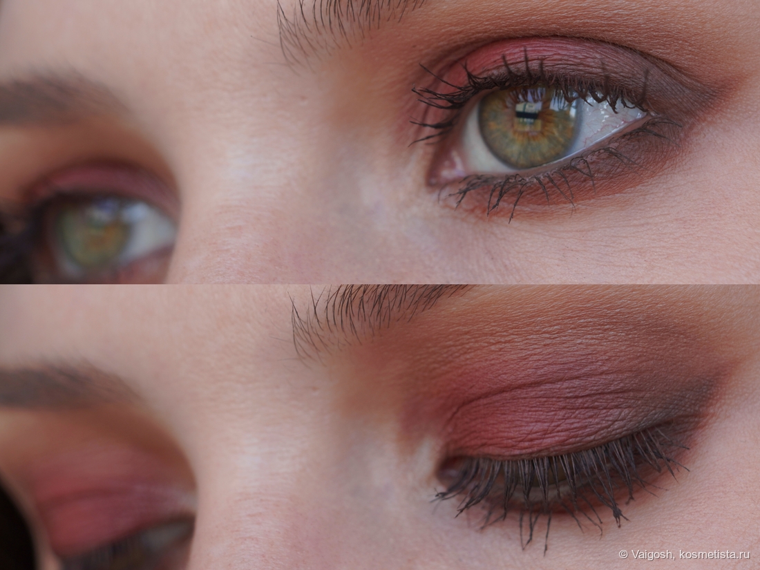 Ну и то, ради чего все: красный — на подвижном веке, бежевый и коричневый — в складке, темно-коричневый — в стрелке и на нижнем веке.