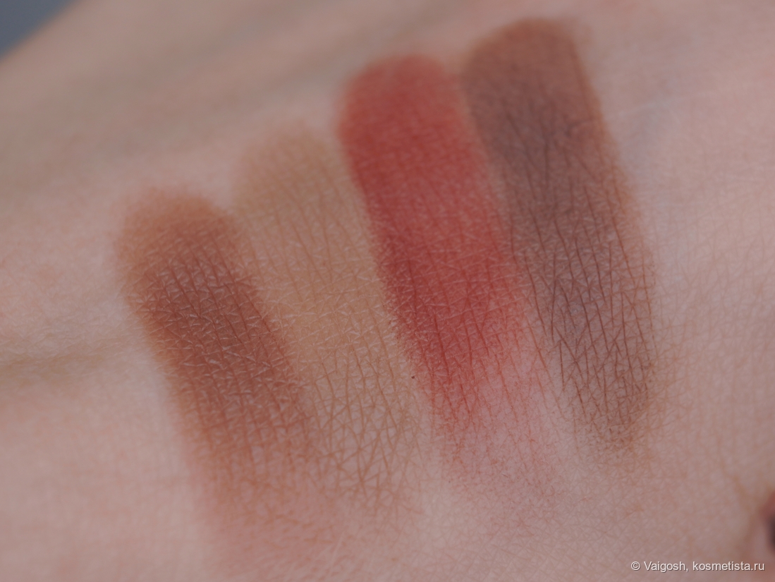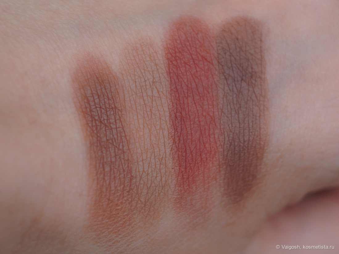 Коричневые оттенки абсолютно одинаковы что на ощупь, что по характеристикам: мягкие, спрессованы не очень плотно, чуть пылят в рефиллах, но зато дружат вообще с любыми кистями и инструментами — хоть белкой их наноси, хоть козочкой, хоть спонжем. А вот красный отличается — он немного тверже и плотнее, пылит меньше и довольно быстро затирается под пальцем. Впрочем, не думаю, что это кому-то помешает: палетка у меня уже не первый год, и все это время я преспокойно ею пользовалась и горя не знала — нюансы текстур вскрылись вот только сейчас, пока я её для поста свотчила.