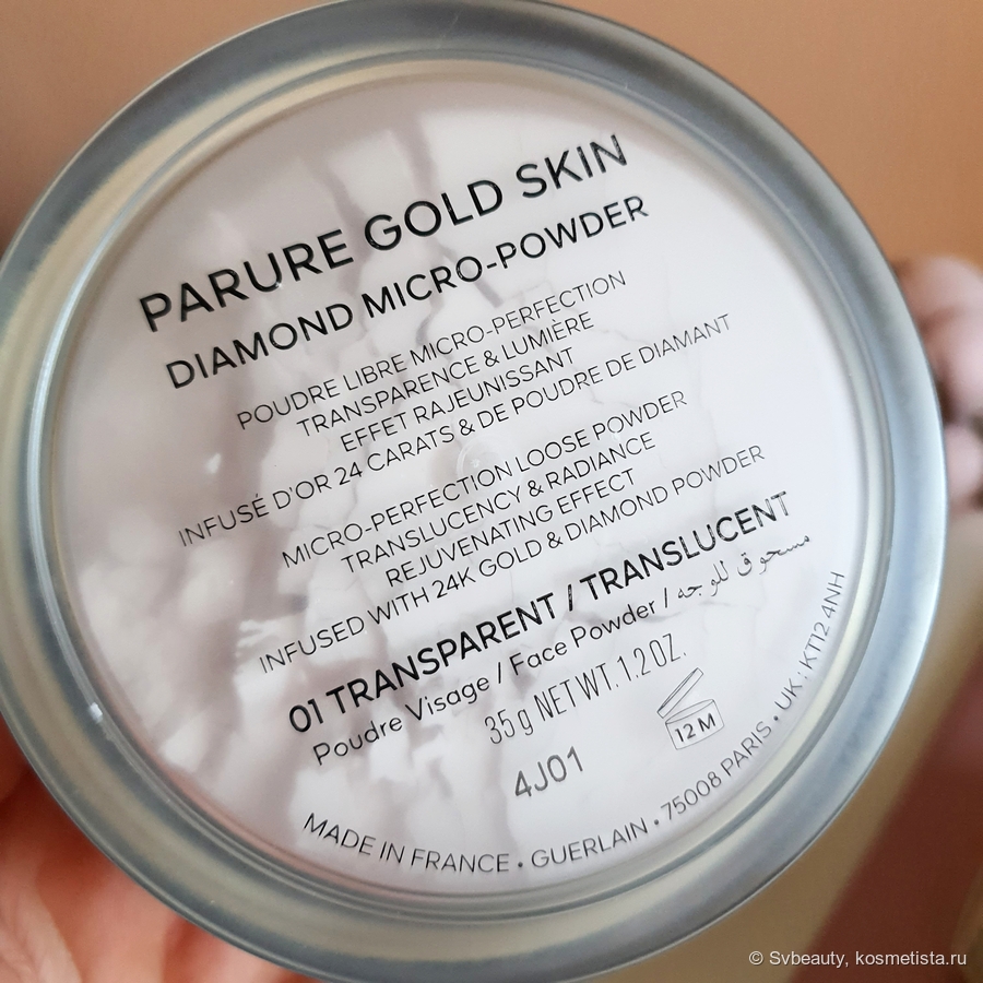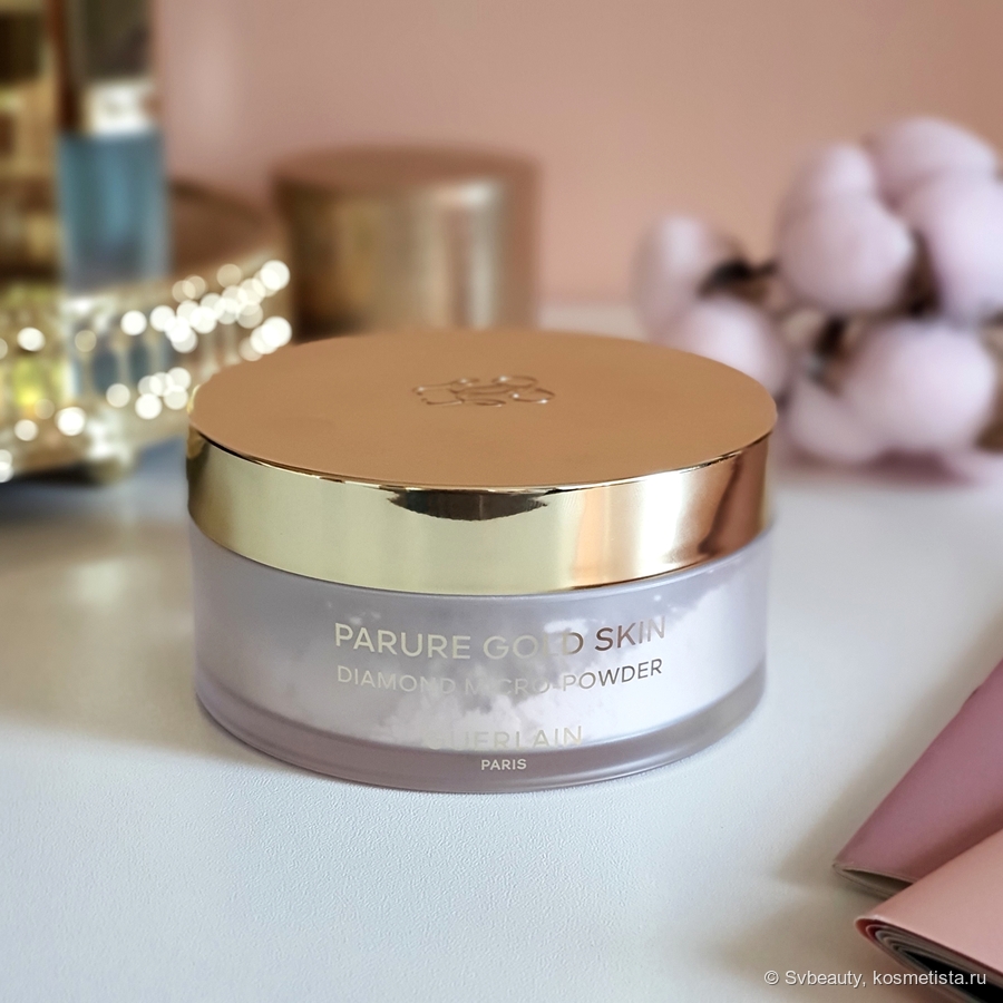 Еще одна пудра, которая, на мой взгляд, заслуживает внимания — рассыпчатая фиксирующая пудра Guerlain Parure Gold Skin Diamond Micro-Powder в оттенке 1 Прозрачный.