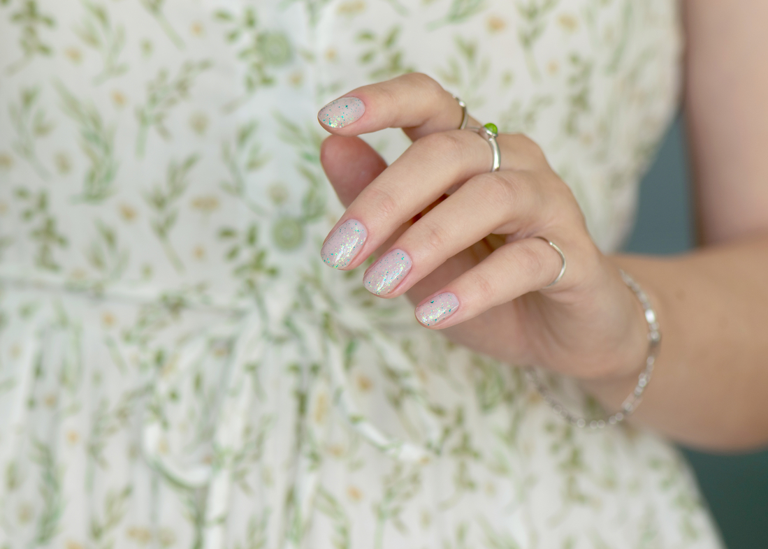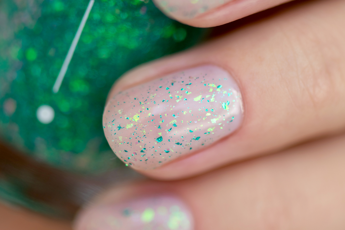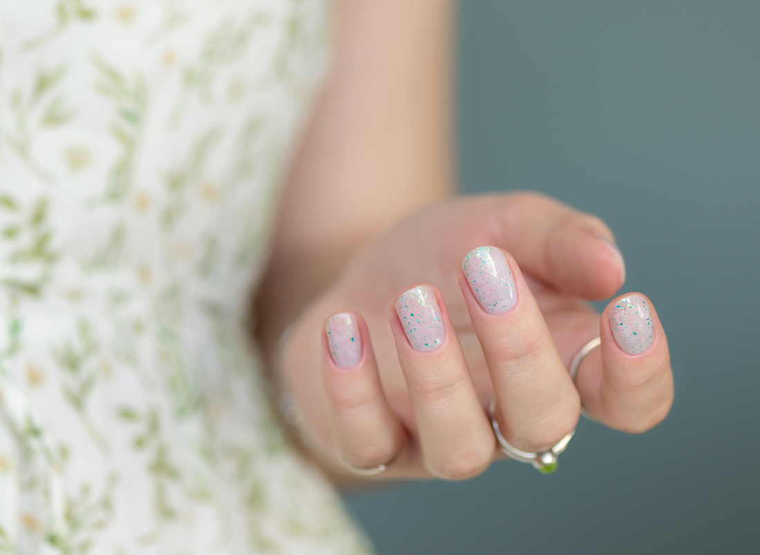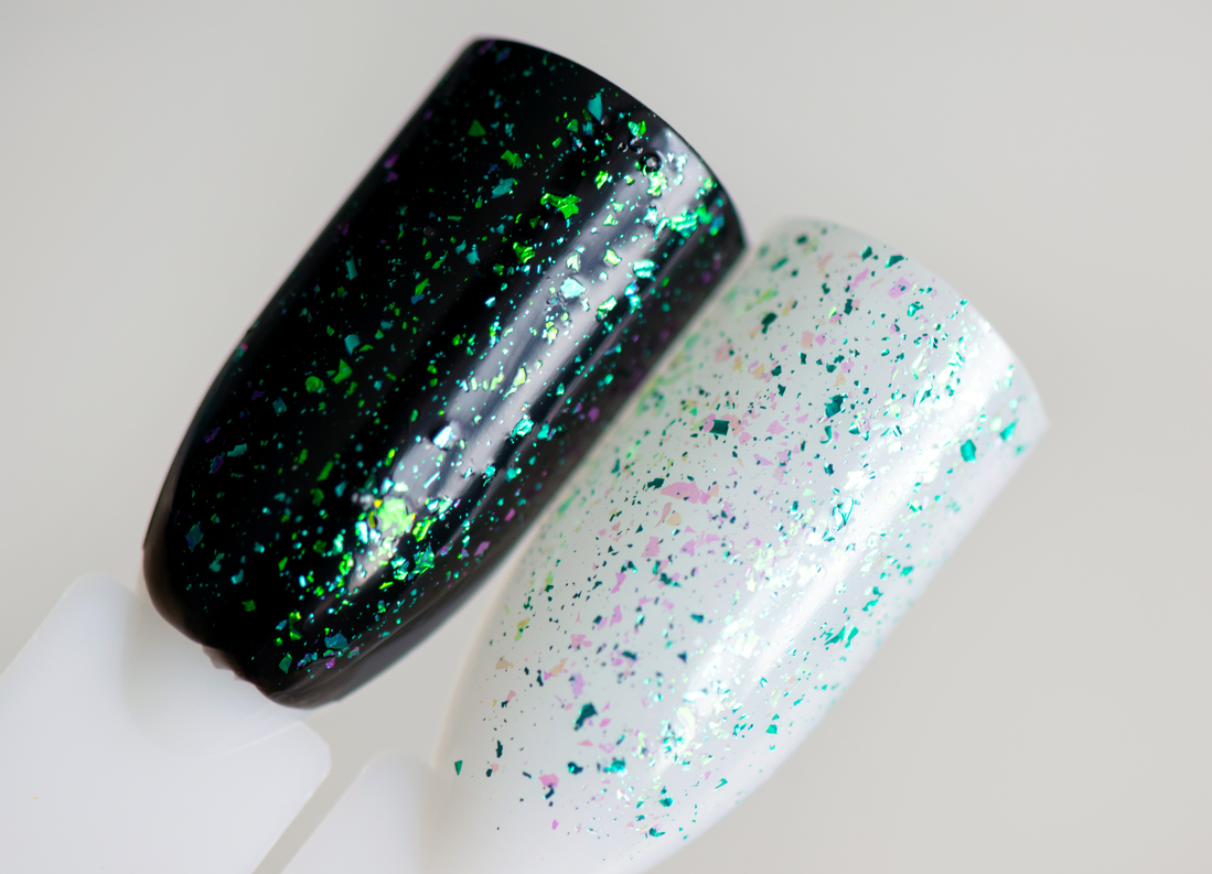 Мне было очень интересно попробовать топ с такой мелкой цветной слюдой) Для демонстрации, наверное, я выбрала не самую удачную подложку, хотелось легкости и воздушности… Но перекрашивать уже не стала, поэтому что получилось, то получилось) Ниже есть фото на типсах с разными цветными подложками. Пишите, какой вариант вам больше понравился)