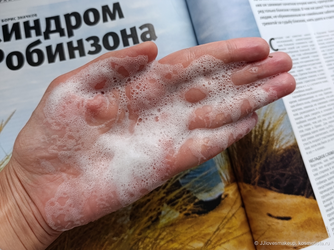 Пенится хорошо, главное — не экономить на количестве, сколько пудры я насыпала в ладонь двумя фотографиями выше, столько и нужно для комфортного применения на лице.