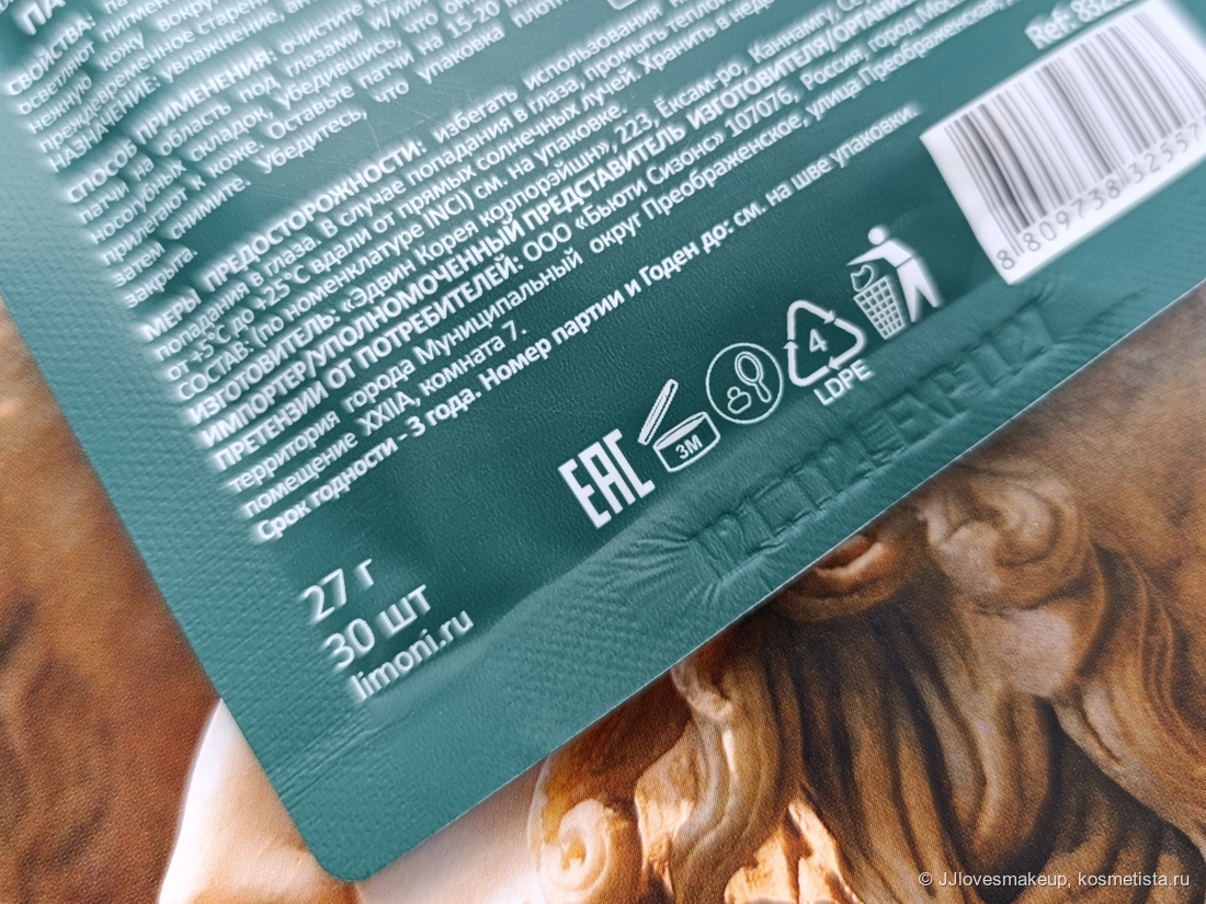 Упаковка: патчи находятся в zip-пакете из плотного пластика, пакетик красивого зелёного цвета, вся информация о продукте напечатана на обратной стороне упаковки, текст читается хорошо.