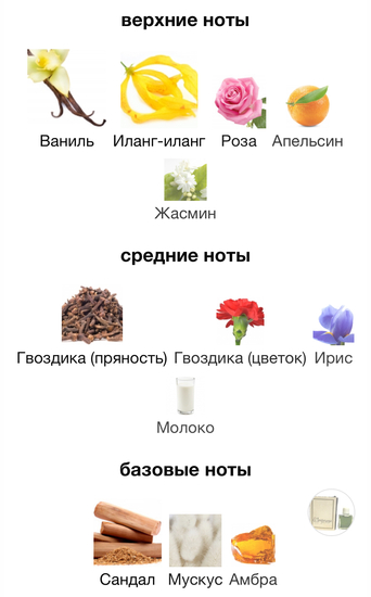 • Средние ноты: гвоздика, иланг-иланг, жасмин, роза