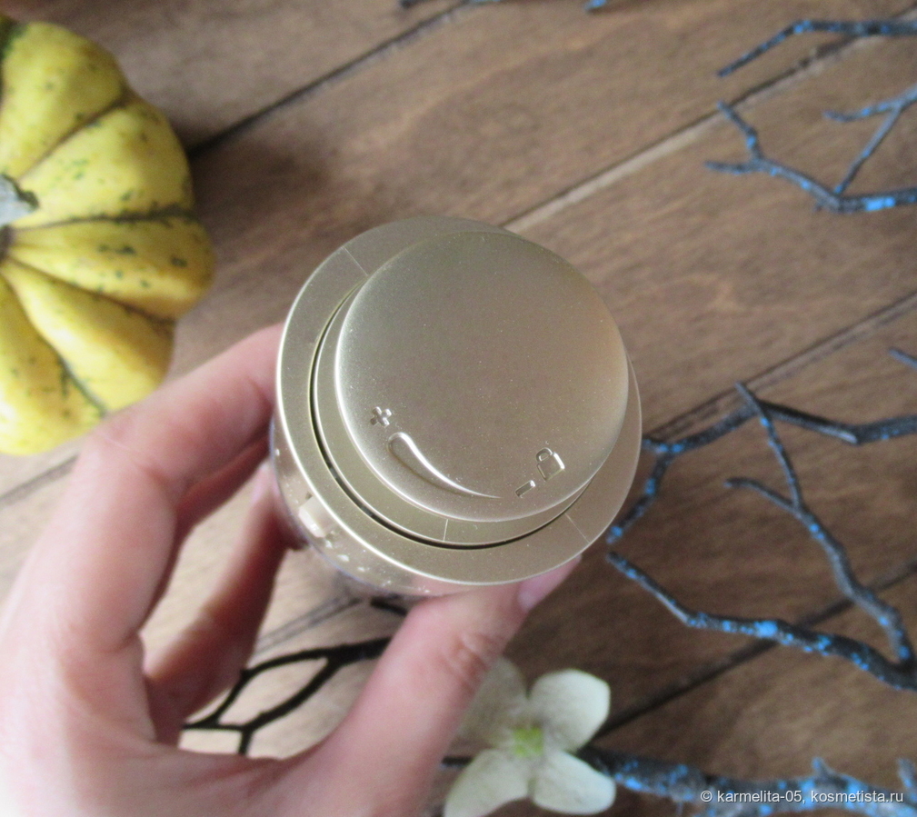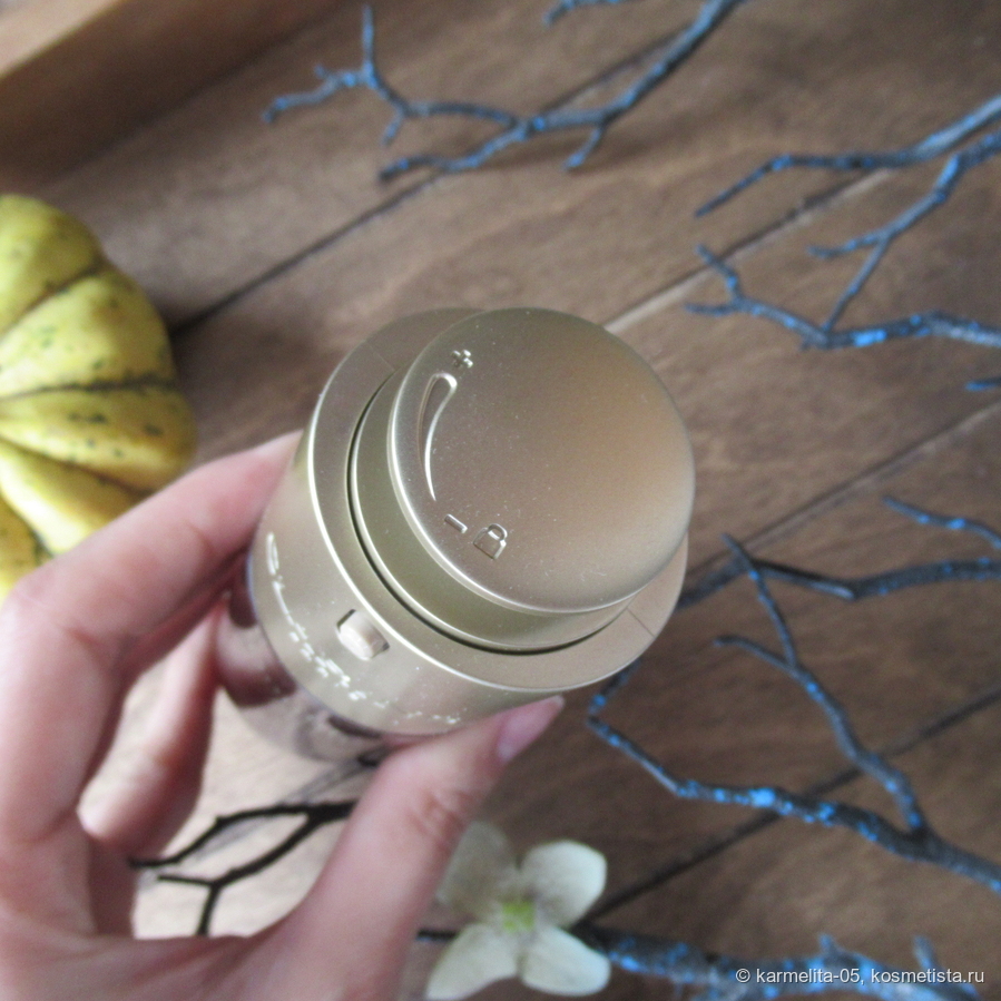 Меня поразил флакон. Тяжёлый толстый пластик с помпой и поворотным механизмом на крышечке. То есть если повернуть в «минус», помпа блокируется и её случайно не нажать (хорошо при перевозках), стоит повернуть в «плюс», можно пользоваться. Более того, благодаря поворотному механизму можно настроить под себя то количество сыворотки, которое нужно именно вам. Шкала на поворотном механизме интуитивно понятна.