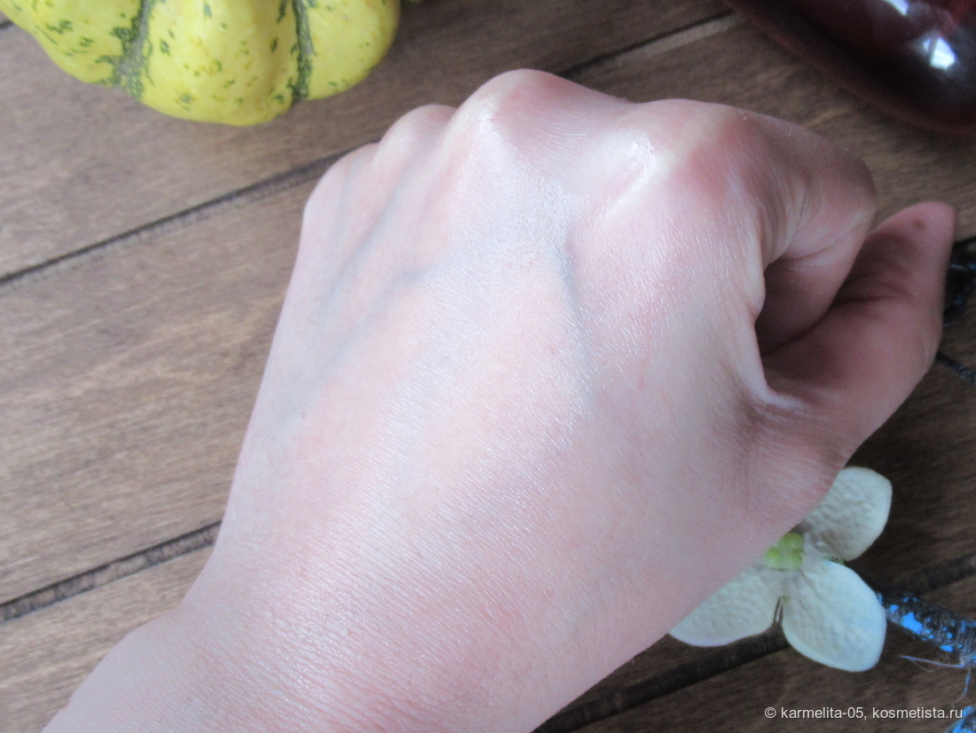 Кожа после нанесения сказочно приятная на ощупь — гладкая, мягкая, увлажнённая и напитанная, но не силиконово-гладкая, а своя, родная, словно на нее ничего и не наносили. Пружинит под пальцами, если ущипнуть себя за щёку!
