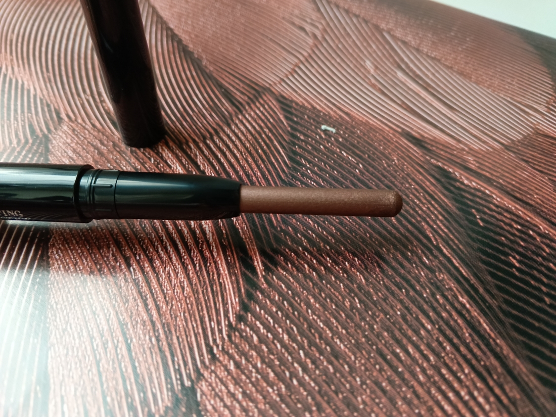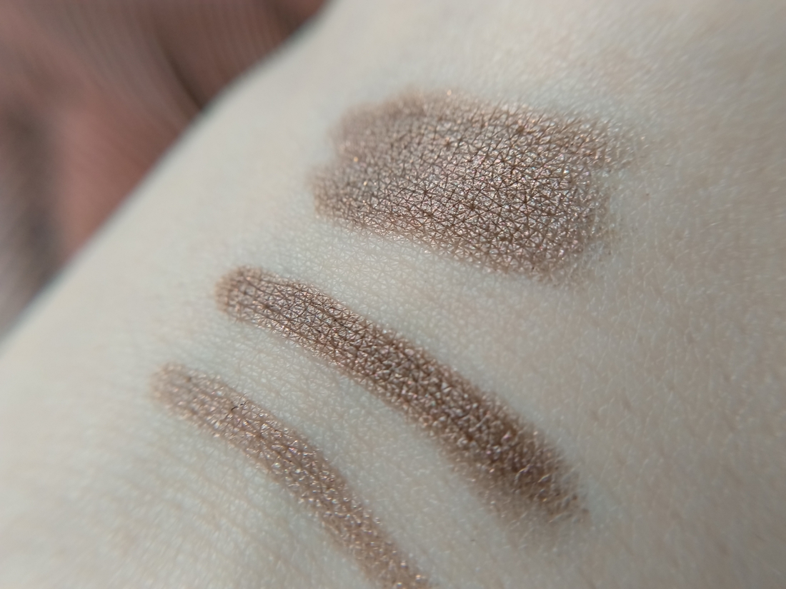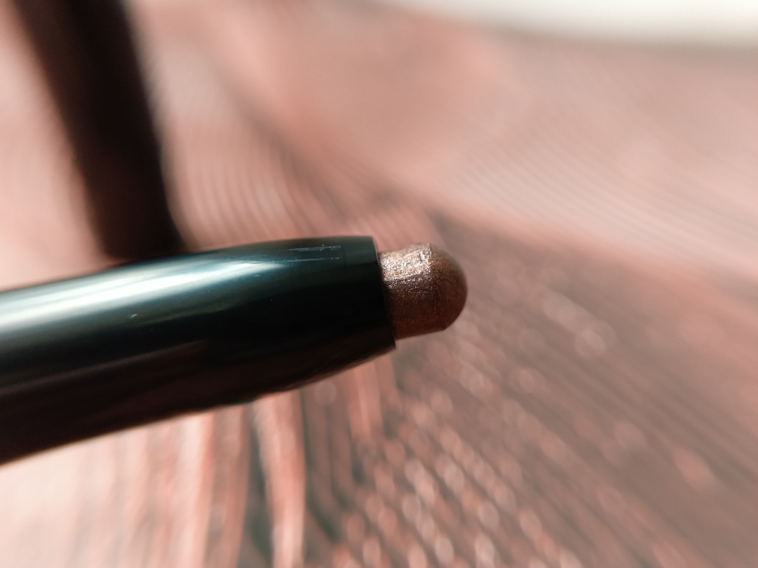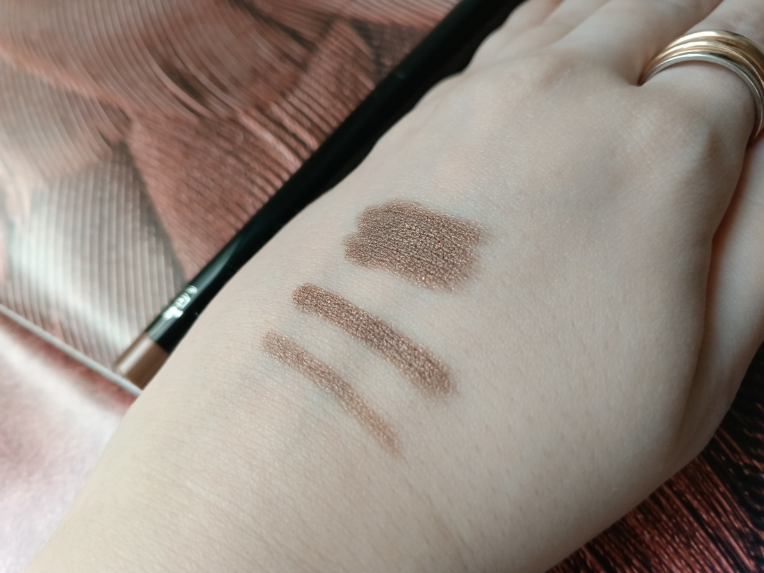 Оттенок бронзовый с красивым не пошлым металлическим отливом. Это не золотистые тени, а именно металлический оттенок коричневого. Наносятся очень мягко, легко отдают цвет, не тянут куски за собой. Правда это пока наносишь тени самим стиком. Если нужно что-то поправить кистью, будет чуть сложнее.