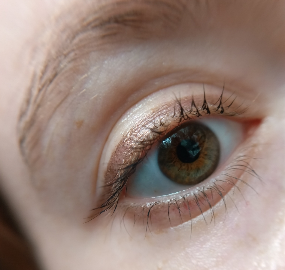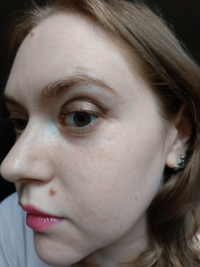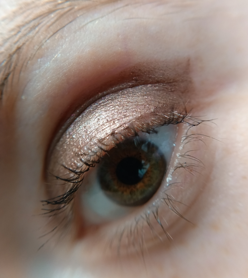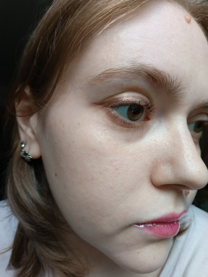 А здесь я нанесла тени из стика на все верхнее подвижное веко и слегка зашла дальше во внешнем уголке глаза. Тщательно прокрасила линию роста ресниц, чтобы не было белых пробелов. А потом ватной палочкой с мицелляркой скорректировала форму теней во внешнем уголке глаза.