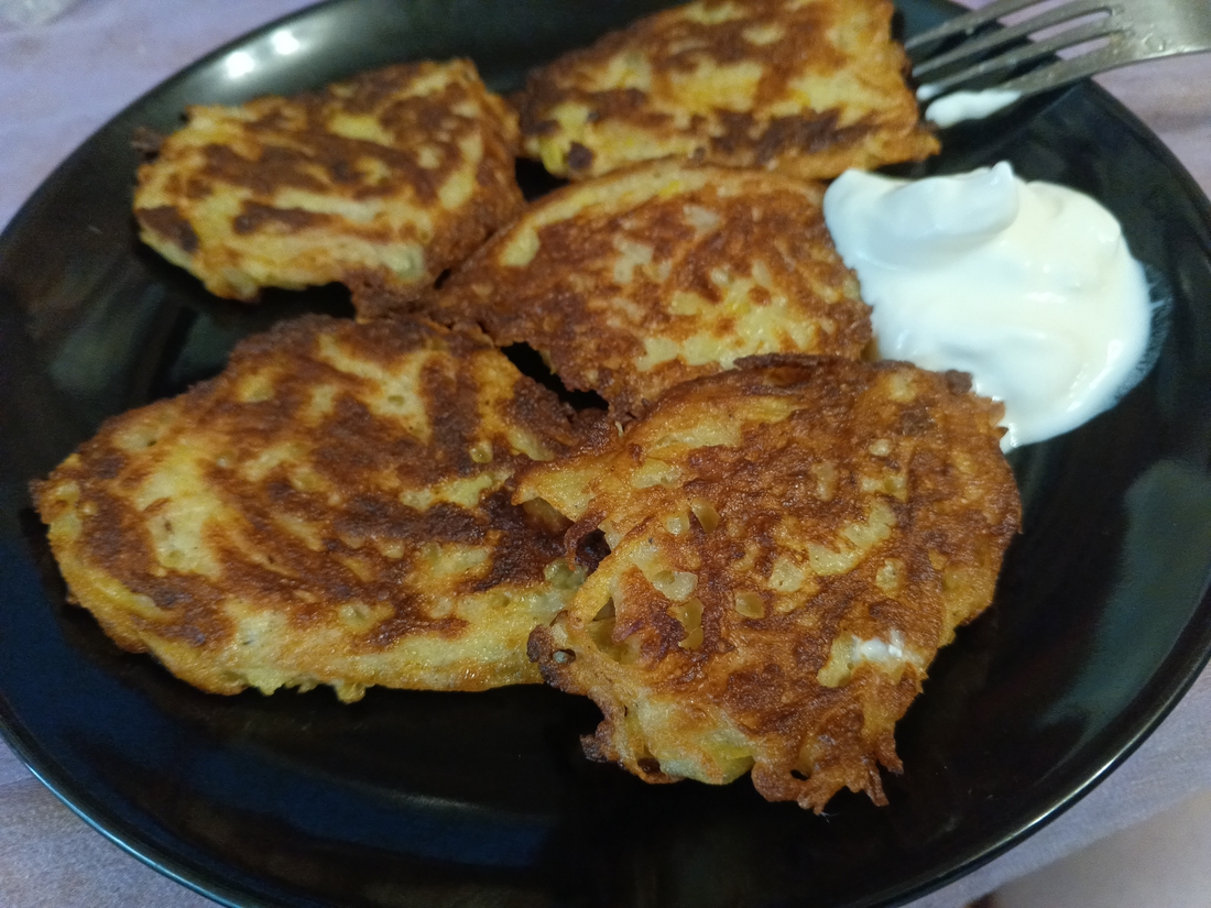 Муж покормил нас ужином, сделал изумительные драники, которые разумеется надо есть со сметаной.