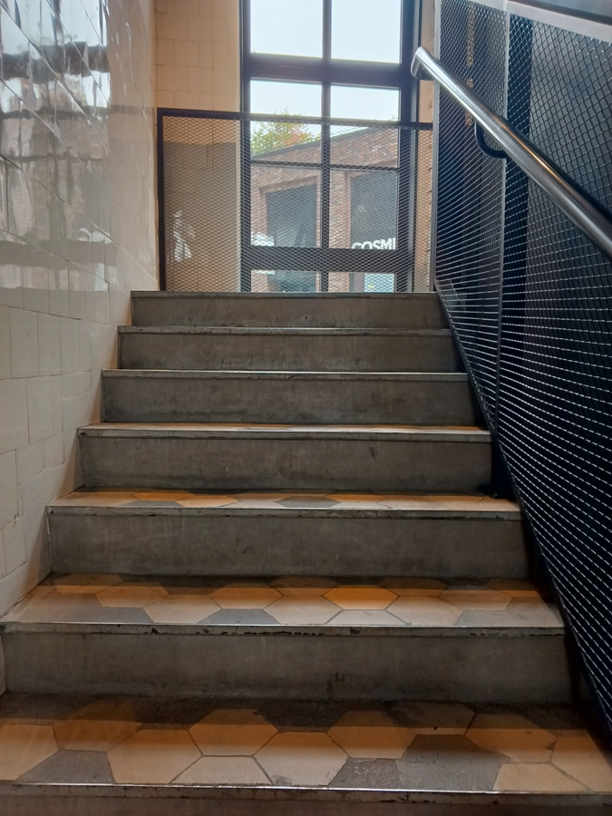 Ориентироваться внутри легко. Гардероб есть на втором этаже, сама выставка на третьем. Забавно, что учитывая высоту потолков, мне все время казалось, что я уже поднялась на нужный этаж, а на самом деле нет. Местный третий располагается примерно на уровне обычного пятого. И подниматься туда нужно по старой узенькой лесенке. Вообще видно, что старались сохранить стены, кирпич и плитка в хорошем состоянии.