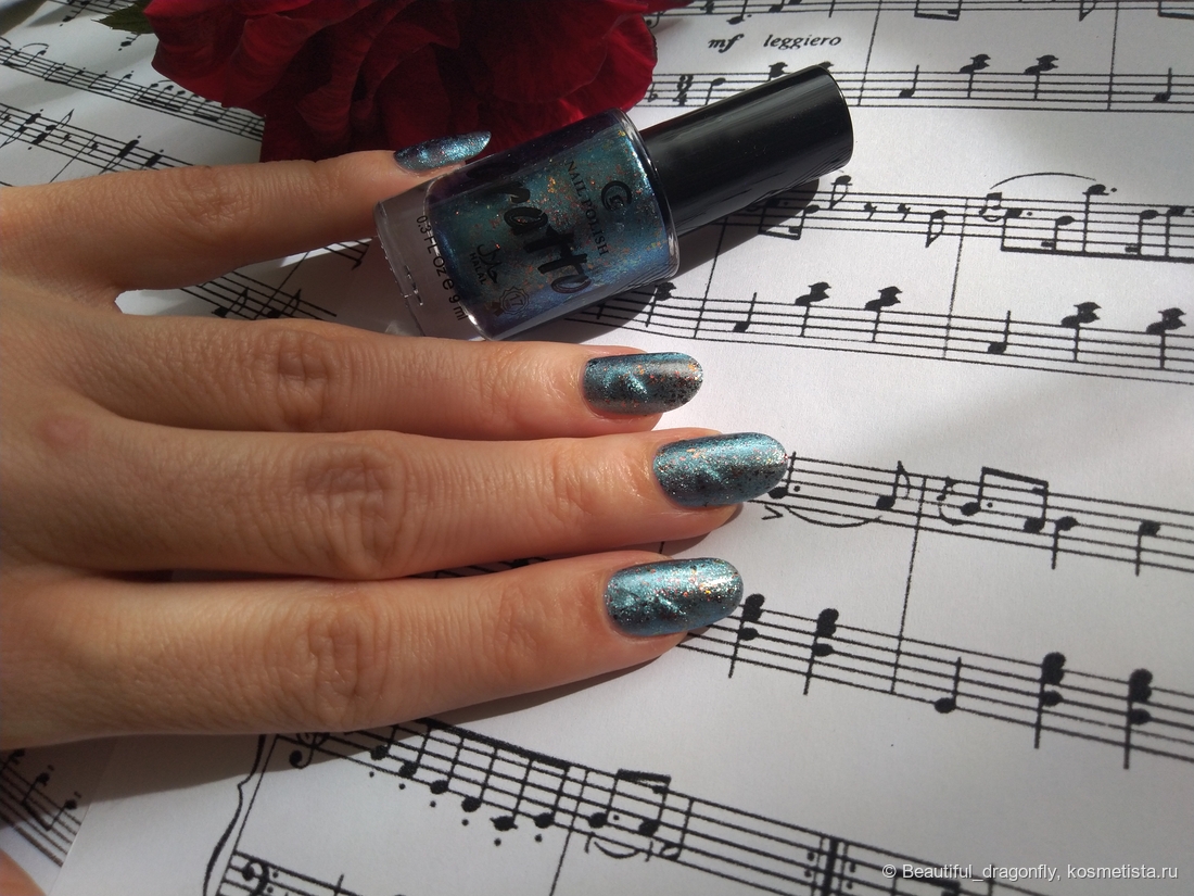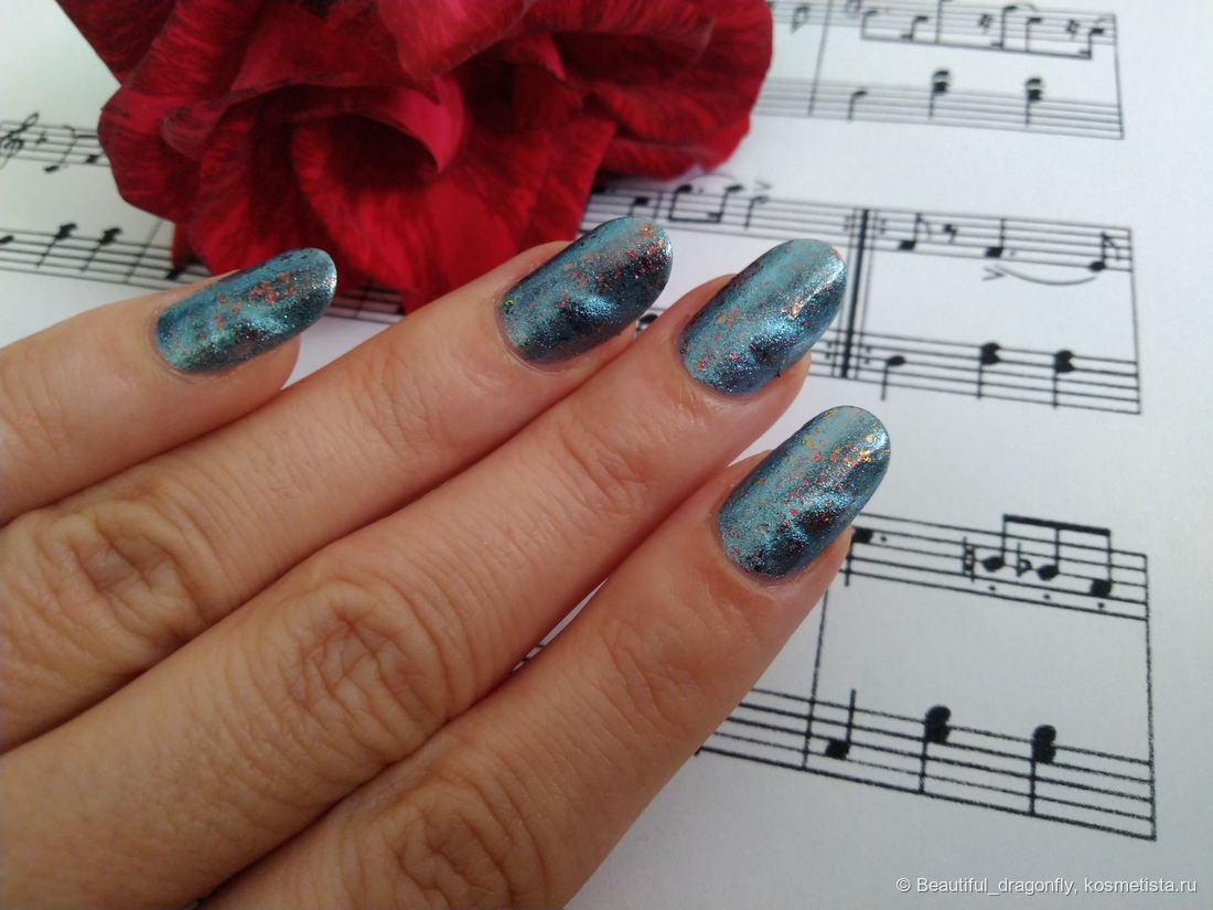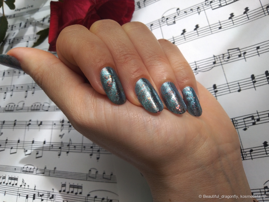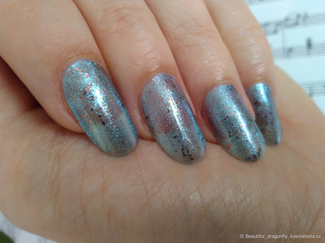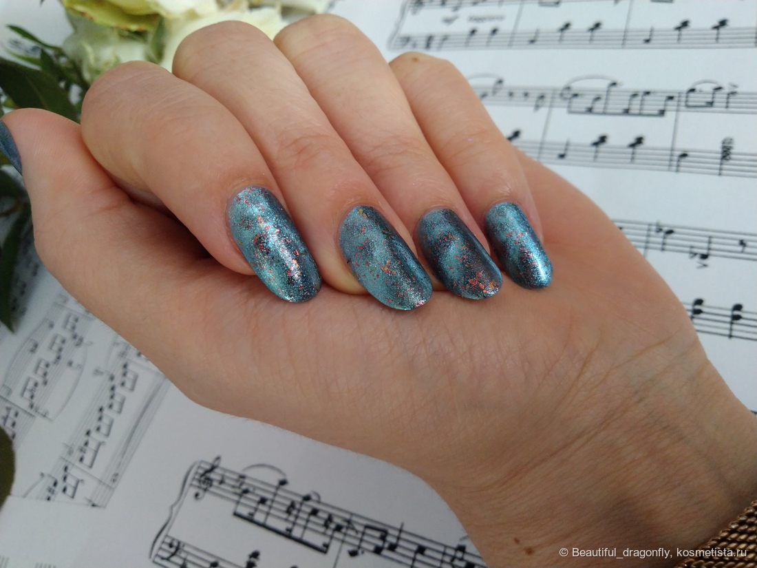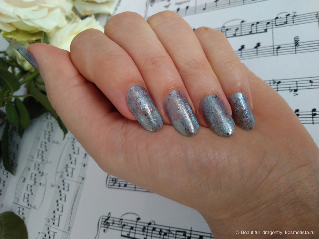 Лак имеет невероятно красивый оттенок поздней осени — это пасмурное дождливое небо с яркими всполохами багряных листьев. А со слов производителя: «сине-голубое желе с медными хлопьями слюды и серебристо-голубым магнитным бликом».