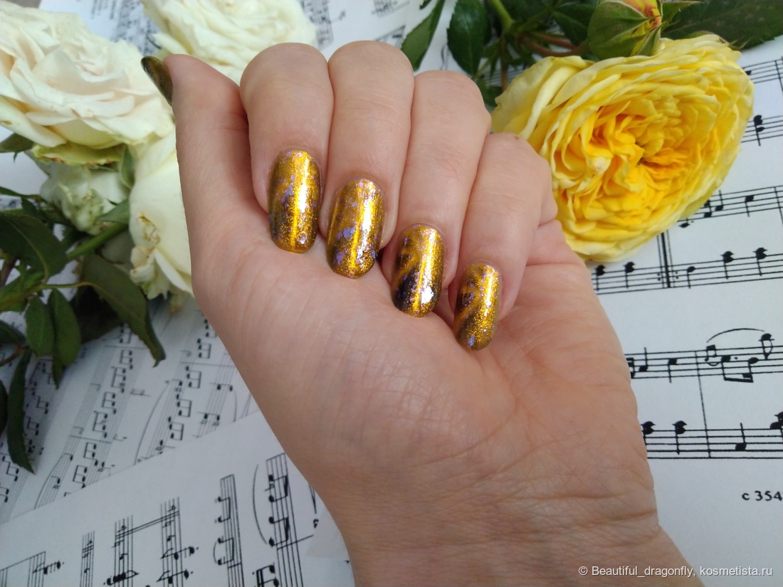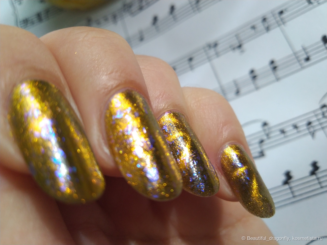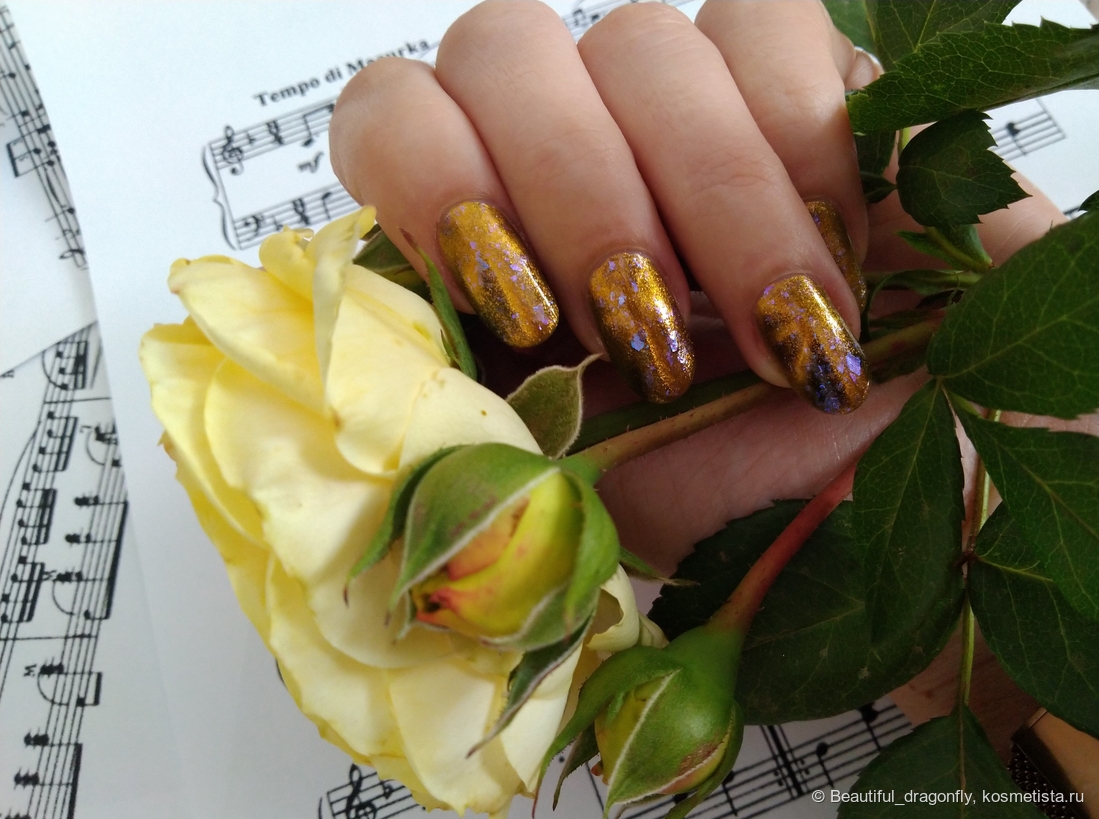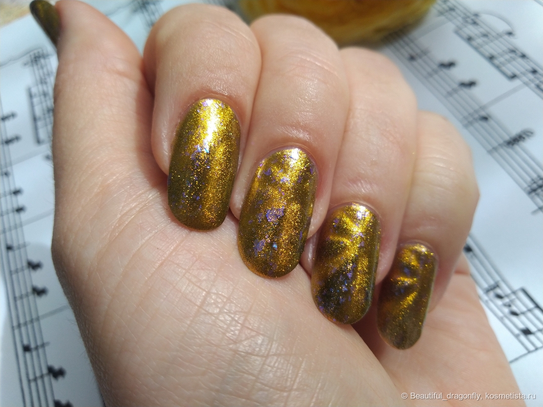 Данный оттенок лака очень нарядный, солнечный и небанальный за счет наличия синевато-фиолетовой слюды, а сочетание чёрного и золотого придаёт лаку благородства и роскоши.